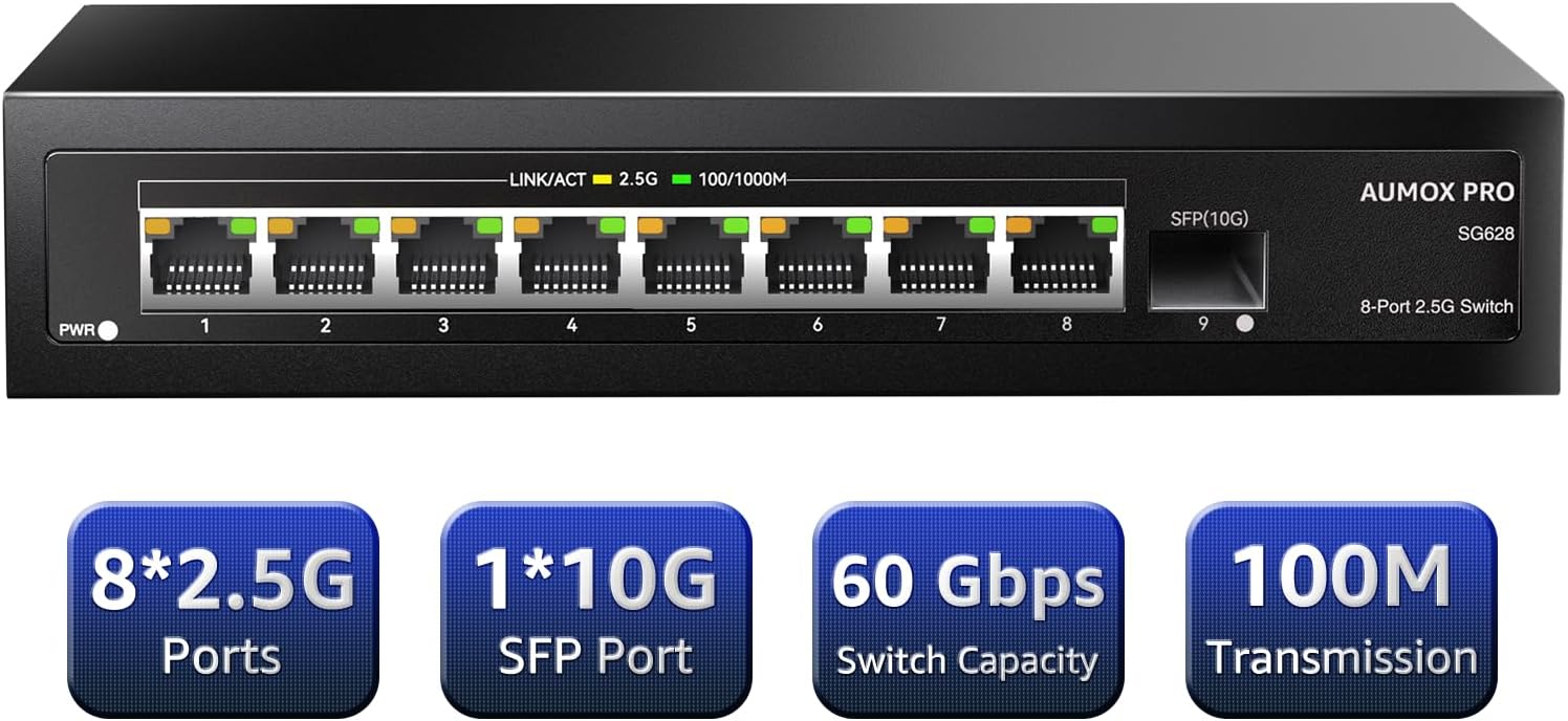 9 Port 2.5Gb Unmanaged Ethernet Switch with 8* 2.5G Base-T Ports, 1*10G SFP Ports, AUMOX PRO 60Gbps Switching Capacity Compatible with 100/1000/2500Mbps Plug and Play