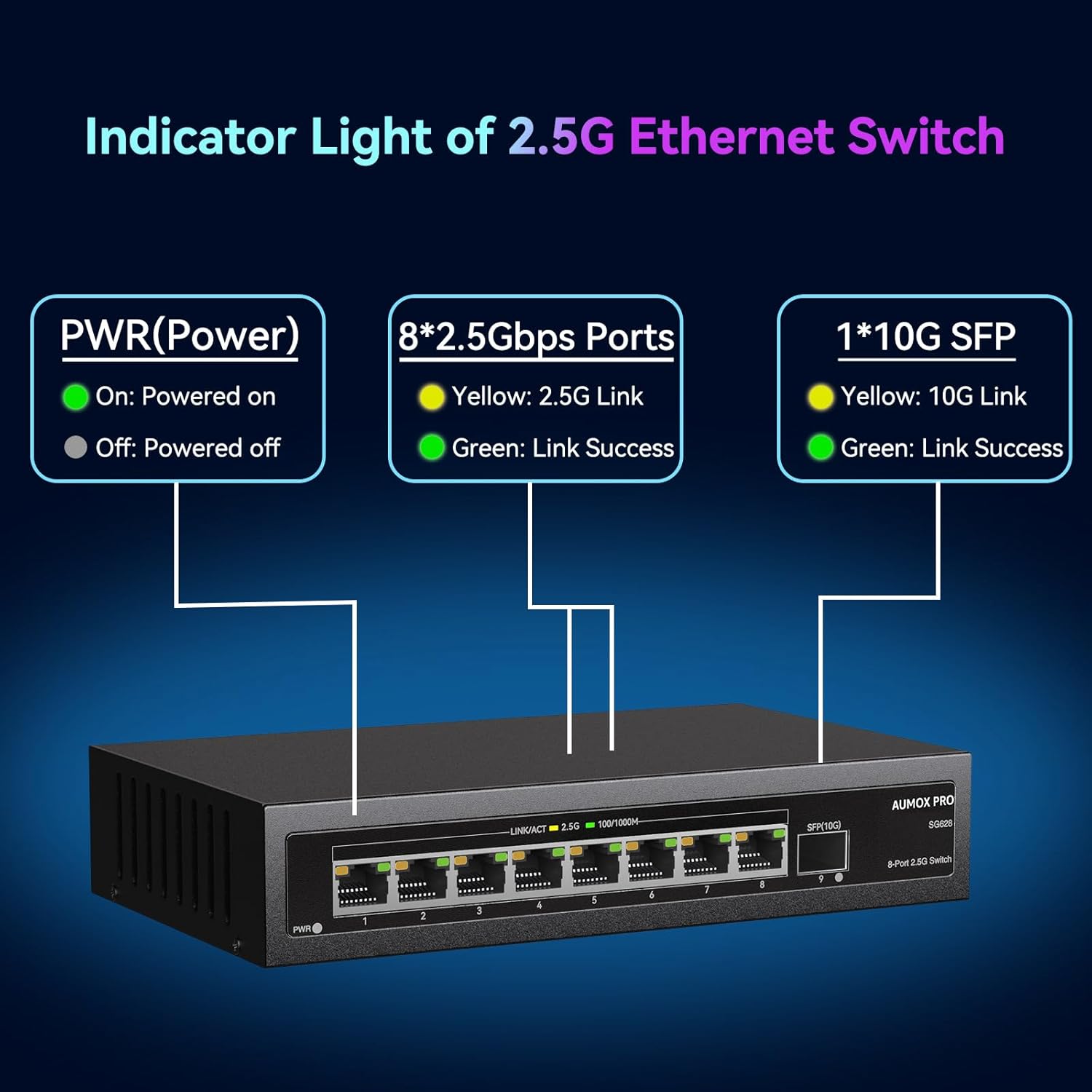 - 【Super-Fast Connections】AUMOX PRO 2.5G ethernet switch delivers 2.5x faster network performance than traditional Gigabit switches. With a switching capacity of up to 60Gbps. Provides super-fast connections to 2.5G NAS, 2.5G Server, gaming computer, 2.5G WiFi 6 AP, 4K video, and more