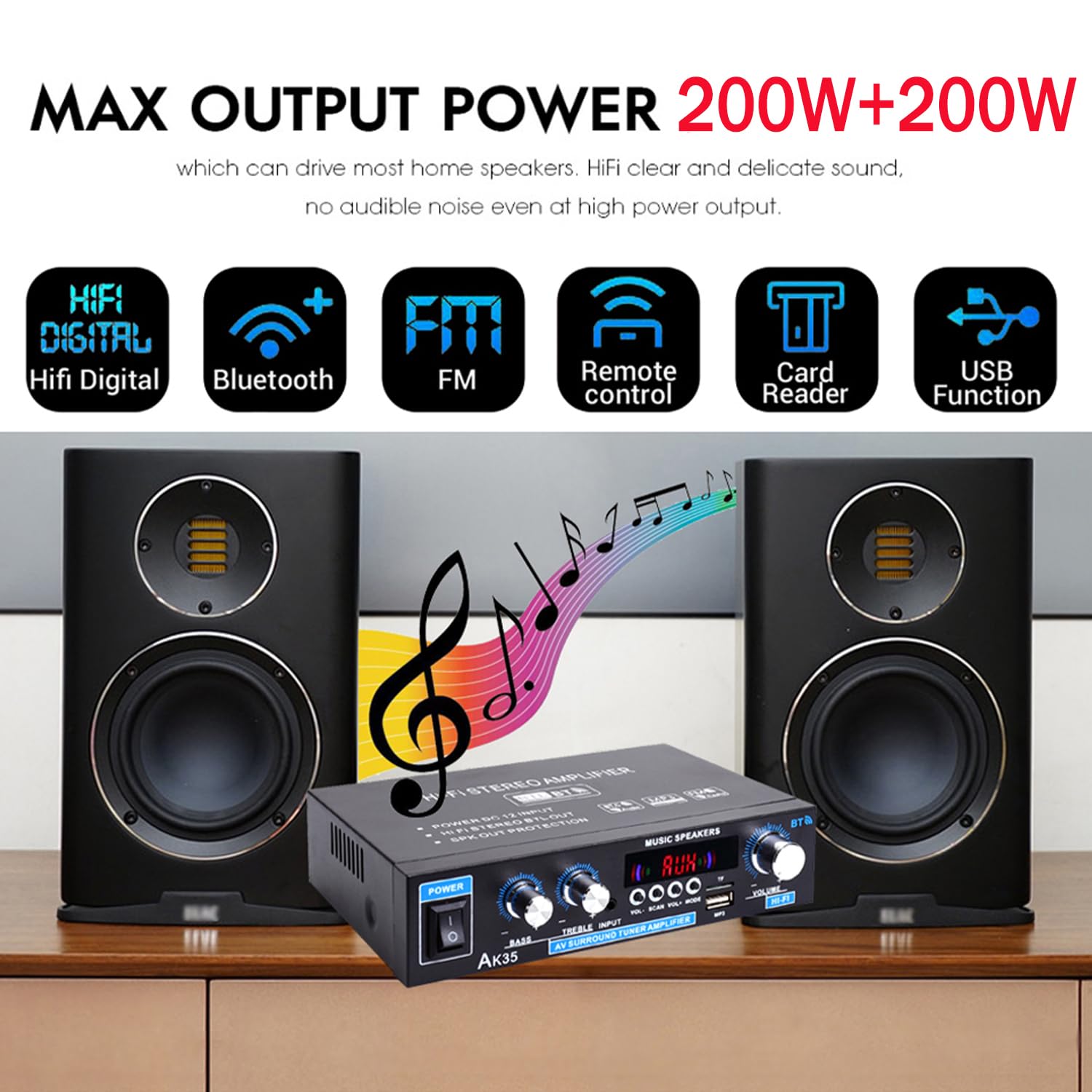AK35 Stereo Amplifier Home Audio Bluetooth 5.0 Max 200W 2.0 Channel Mini Amplifier Stereo Receivers for Car, Home Party, Audio Amplifier AMP w/USB/TF Card/AUX Input/Bass & Treble Control