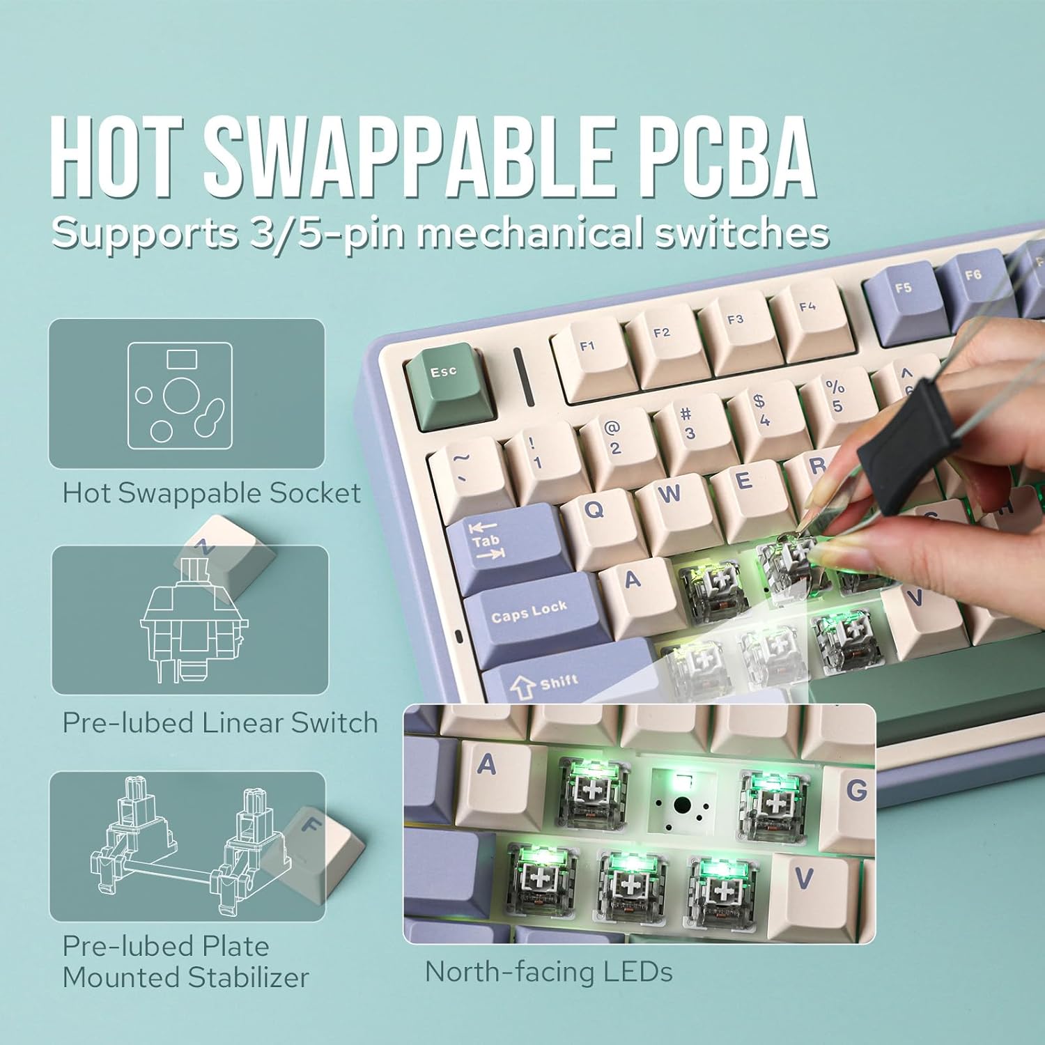 - ăFinely-Calibrated Stabilizers&Cherry Profile Double-shot PBT KeycapsăDiscover refined keystrokes with our precision-tuned stabilizers, offering stability and a hushed typing experience. Say goodbye to key wobble as your keystrokes gain enhanced accuracy. The F75 takes durability to the next level with its Cherry-profile double-shot PBT keycaps, ensuring a perfect blend of robustness and stylish design. These keycaps stand resilient against wear, maintaining a sleek appearance that defies the test of time.