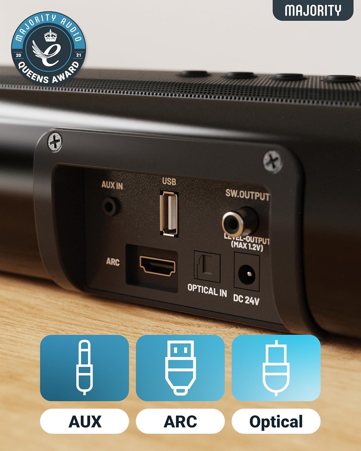 Majority Bluetooth 120W TV Sound Bar for Smart TV, 24 Inch, 2.1 Channel, 3D Sound with Built-in Subwoofer | EQ Control, HDMI Arc, Optical, AUX, Remote, and Wall Mountable Naga 60 Soundbar for TV