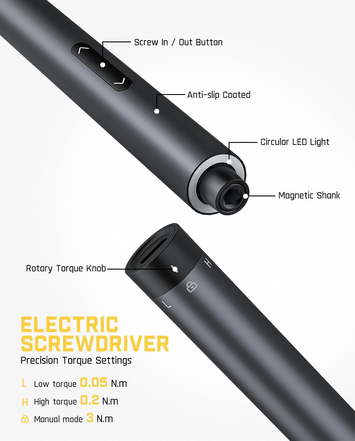 - Robust Efficiency In Half the Working Time: Equipped with an electric precision screwdriver, it takes half the regular time when maintaining your electronic gadgets. With dual torque settings of 0.05 N.m and 0.2 N.m, and a manual gear of up to 3 N.m, the versatility is endless.