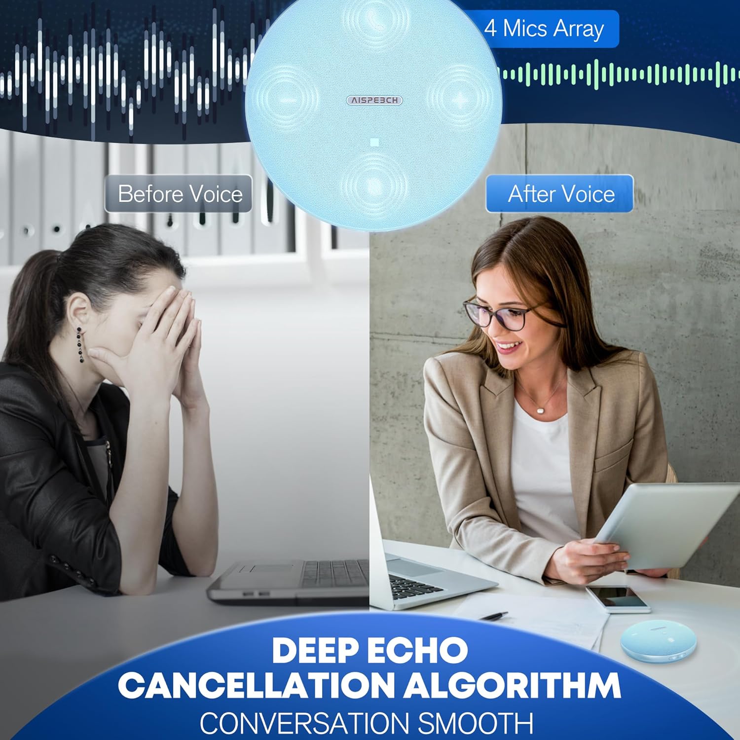 - 【AI-Powered Noise Reduction】Say goodbye to noisy conference calls with our M4 speakerphone! This M4 bluetooth speakerphone is equipped with advanced AI technology that has been trained on thousands of hours of real-world conference call data. By intelligently differentiating between human voices and ambient noises, common background noises in the workplace, such as mouse or keyboard clicks, loud conversations and other noise, can be effectively reduced. Ideal for office or home working.