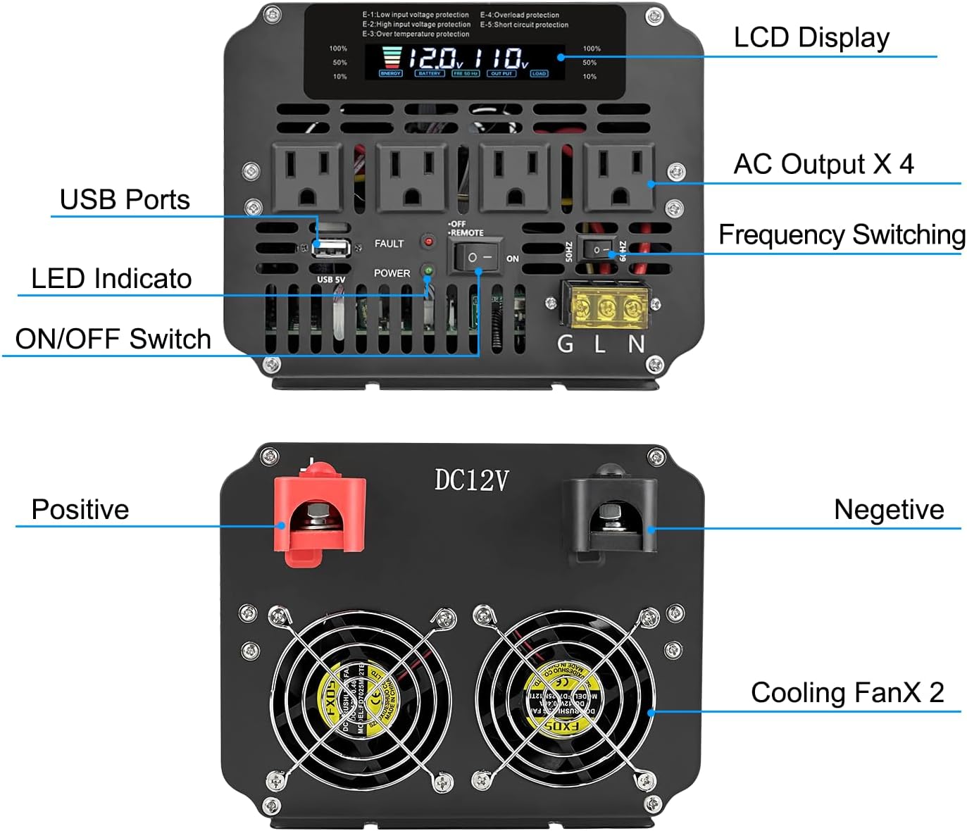 - 【Real-Time LCD for Performance Monitoring】Stay informed with a smart LCD display showing voltage, battery level, load, and alerts - essential for safe operation of any car inverter 12v to 120v system