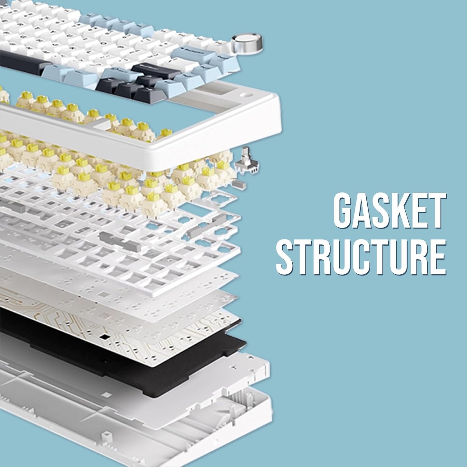 - ăOptimized 75% Compact Layout&Innovative Gasket StructureăThe F75 redefines space efficiency with its 75% compact layout. This design integrates all the essential keys in a smaller footprint, making it perfect for streamlined desks and mobile setups without sacrificing functionality. Experience the pinnacle of comfort with the gasket structure. This advanced design ensures a flexible yet firm typing experience, reducing fatigue during prolonged use while maintaining a consistent and responsive key feel.