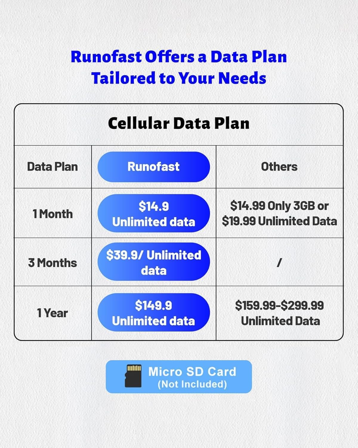 - Data Plan Required for 4G Cellular: Runofast security camera can work anywhere with 4G LTE coverage in the United States such as barn, farm, ranches, construction sites, vacations homes, warehouse, RVs.Trial data can be activated after the camera is connected to a 4G network. After the 300M trial data is used up,Pay this service now,and get unlimited 4G high-speed data services in the United States.(No data limits: 14.9 USD/month,39.9 USD/3months,149.9 USD/years)