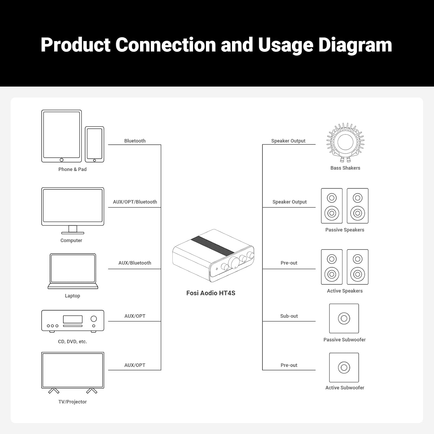 - All-in-One Amp: A mini amplifier that integrates DAC and power amplification. This stereo amplifier supports up to 5 channels output, switchable between 4.1 and 5.0 channels. It features Bluetooth, AUX, and optical digital inputs, along with pre-out and support for up to 5 speaker outputs. Note: The HT4S is a stereo amplifier and does not support Dolby, DTS, or other multichannel surround sound modes
