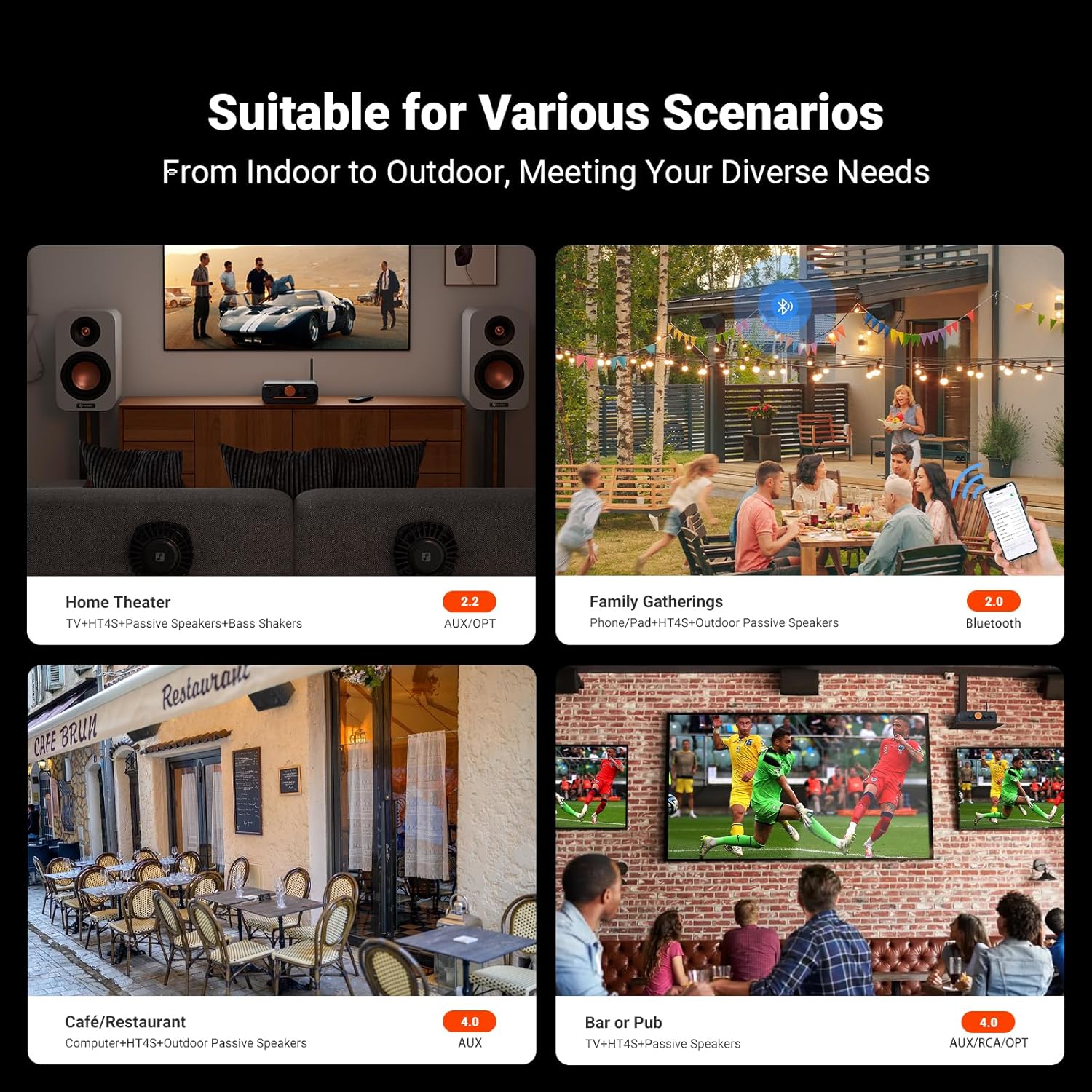 - Multi-Scenario Solution: Ideal for pairing with outdoor speakers or wall-mounted speakers, perfect for setting up 2 to 5-channel audio systems in environments like patios, cafes, restaurants, bars, etc. It can also serve as a home theater or desktop HiFi system amplifier, meeting your diverse needs from indoor to outdoor settings