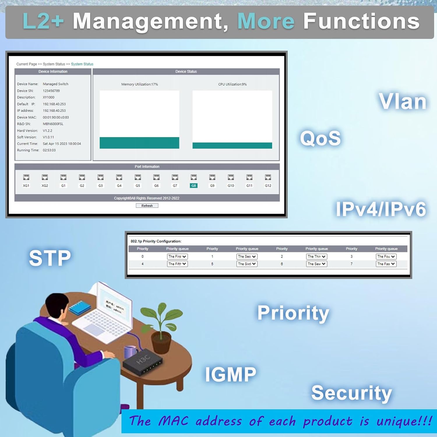 - 【Outstanding L2+ Management】The switch not only support easy management function like Ring Network, VLAN, STP/RSTP, but also IPv4/IPv6 Management and Static Route.