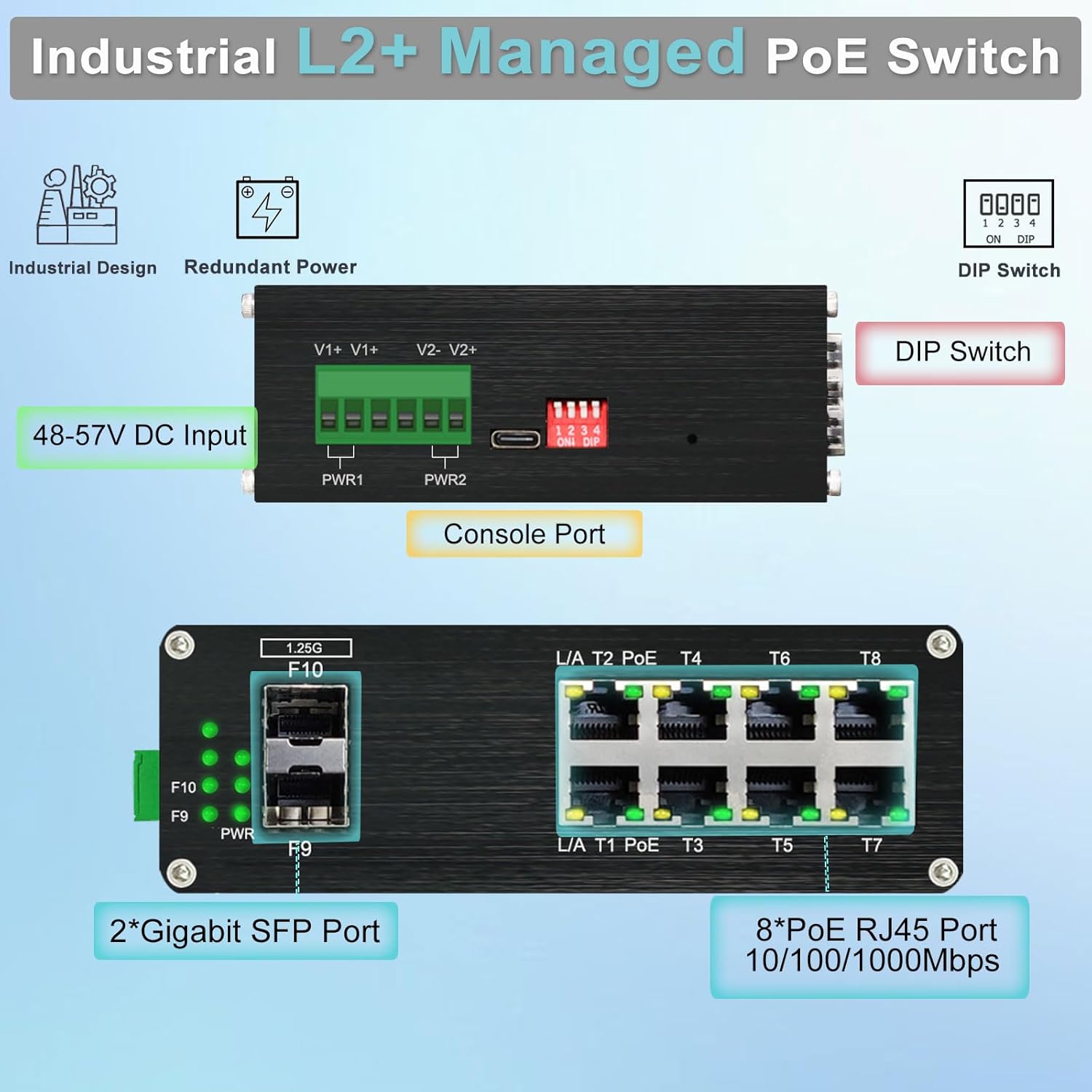 Industrial L2+ Managed 8 Port PoE Ethernet Switch with 2 SFP Slot, Gigabit Networking Switch with IPv4/IPv6 Management and DIP Switch, Supporting Din-Rail