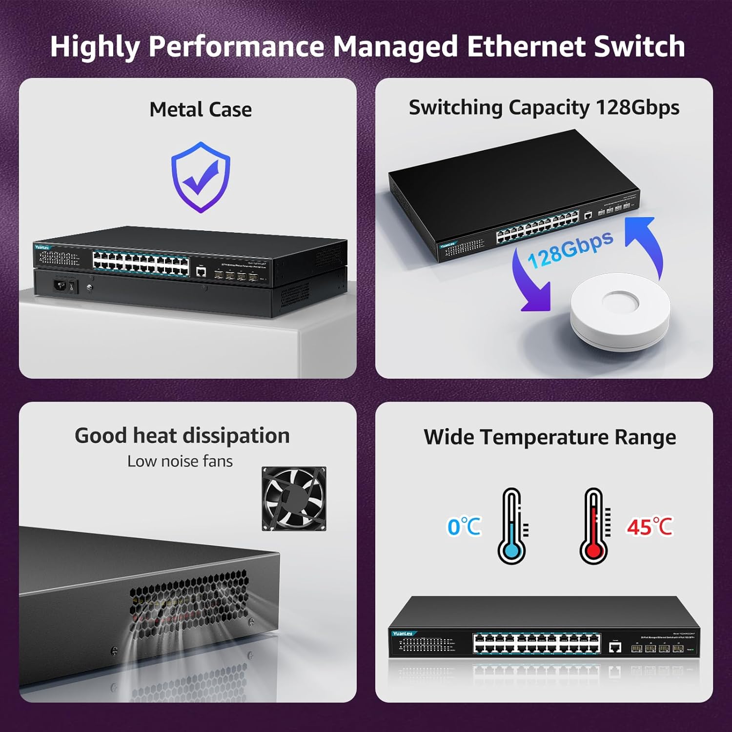 - 【Multiple Applications】YuanLey managed switch is designed exclusively for the networking needs of growing businesses, with an extensive suite of management and security features available. These devices are cost-effective for small and medium-sized businesses, providing ideal solutions for a variety of network scenarios. It can be widely used in small and medium enterprises, Internet cafes, hotels, schools and other Ethernet access scenarios.