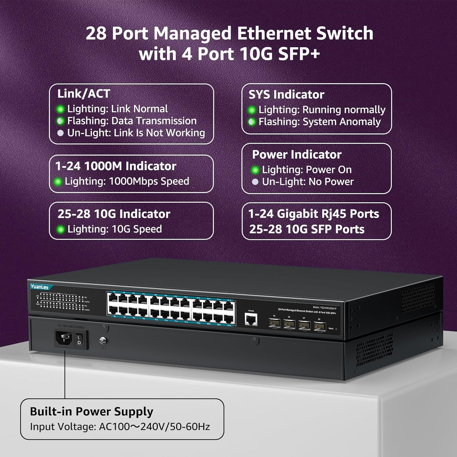 - 【24 Port Gigabit Managed PoE Switch】This network switch from YuanLey is a L3 managed poe switch equipped with 24 Gigabit poe+ ports and 4*10G SFP+ slots. With abundant L3 management features supported, switching capacity 128Gbps, it is capable of delivering high throughput to even the most demanding edge-of-network workgroups, while in small networks it can act as a backbone for Gigabit switches and high-speed servers. 4 SFP+ slots provide greater network flexibility.