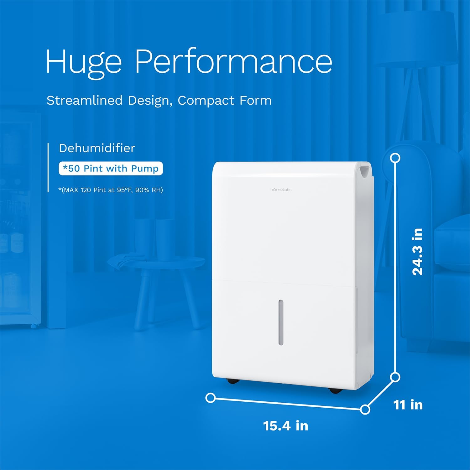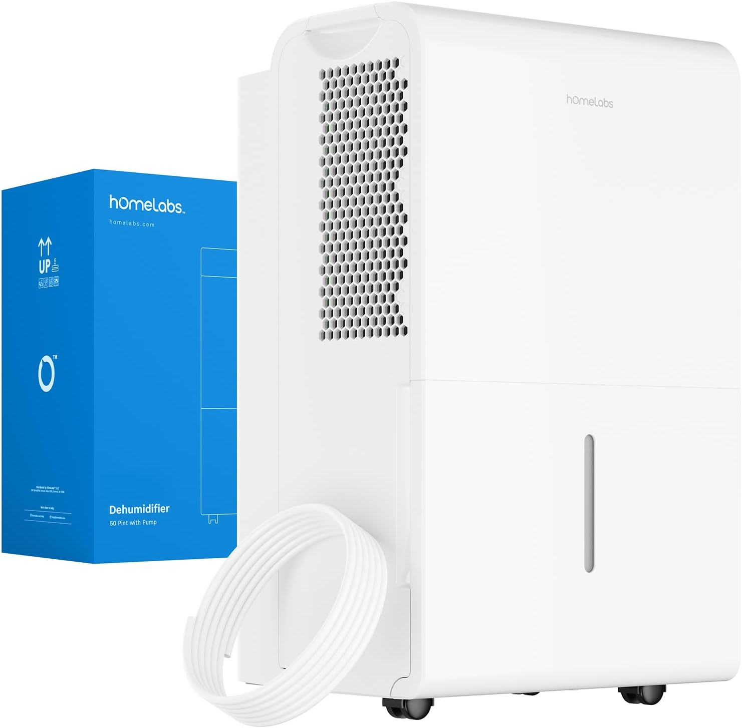 hOmeLabs 50 Pint Wi-Fi Dehumidifier with Pump for up to 7,000 Sq Ft (MAX 120 Pint at 95°F, 90% RH) – High Capacity Moisture Removal for Large Rooms, Offices, and Basements
