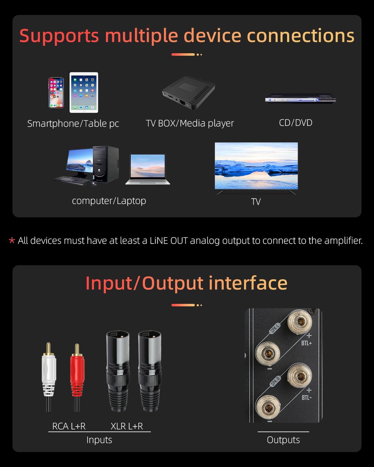 - Wide Application ▶ Balanced XLR/single-end RCA input supports multiple device connections:computer/laptop/smartphone/Table pc/CD/DVD/TV BOX/media player/TV, etc. Recommend for home TV audio, computer audio system-game, bookshelf speakers, floor standing speakers and other passive speakers.