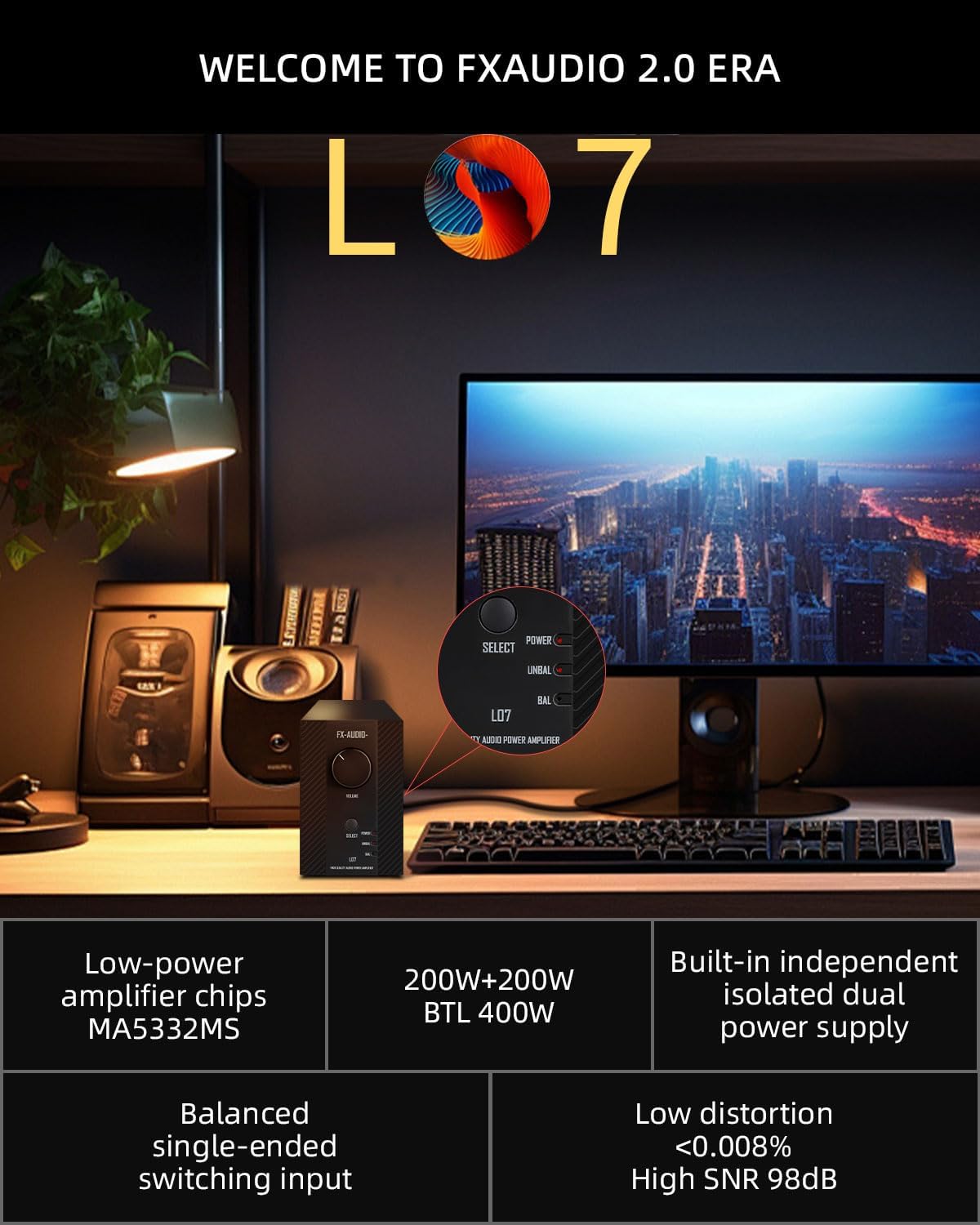 - 200W + 200W HiFi Stereo AMP ▶ FX-AUDIO- L07 Compact Desktop Class D Amplifier is all about delivering a pure, balanced, and immersive audio experience right on your desktop. Fully balanced architecture, left and right channel separation is higher, the sound is cleaner. Can be combined with multi-channel high-power home theater system.