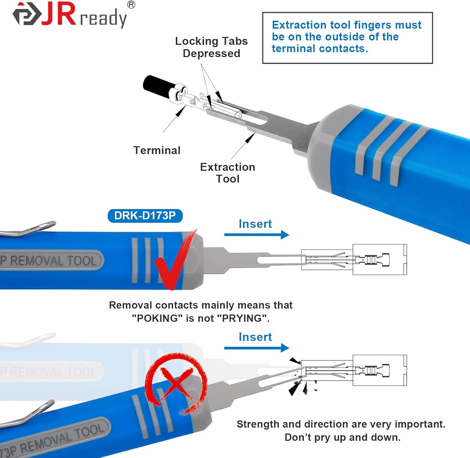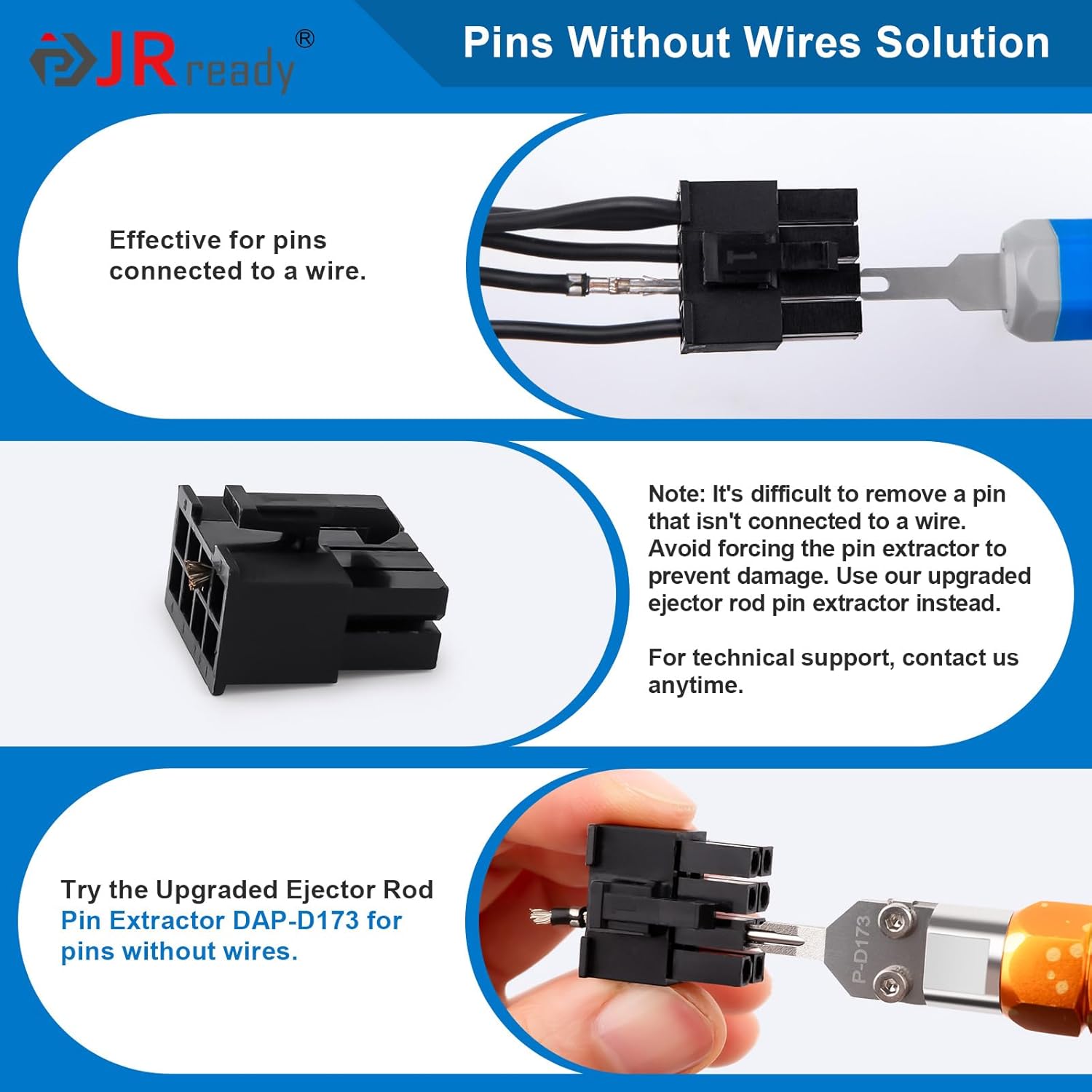 - [JRready Commitment] At JRready, customer satisfaction is our top priority. We offer high-quality products and support. Our DRK-D173P pin removal tool is ideal for extracting pins that still have wires attached. For pins without wires, we recommend our enhanced Ejector Rod Pin Extractor, crafted for both precision and efficiency. For extra support, feel free to contact us anytime. We're always here to assist!