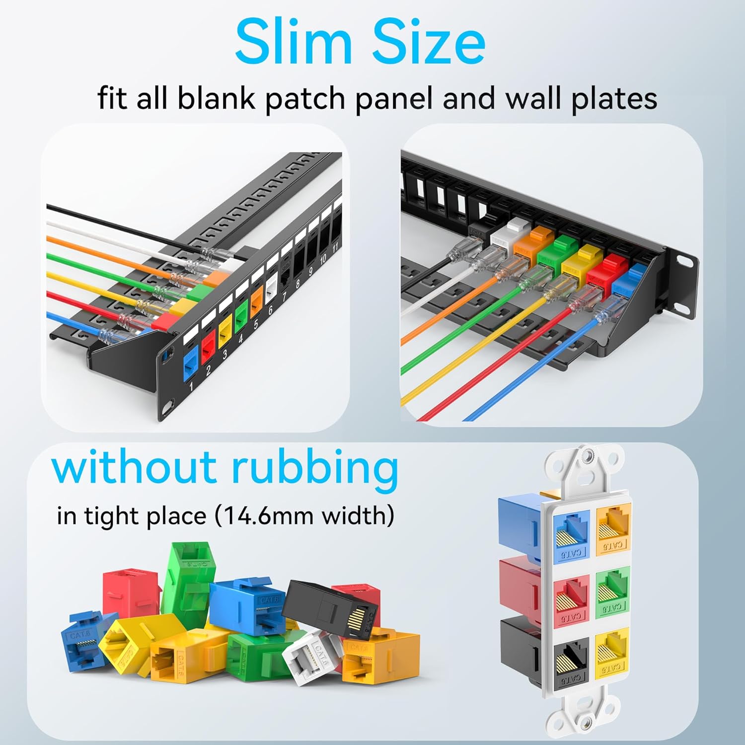- Slim Size: Keystone coupler is slim and compact, making it easy to install in tight applications such as wall plates and patch panels. Ethernet coupler female to female are narrow enough to fit into a 24 port rack and 6 port wallplate without rubbing each other.