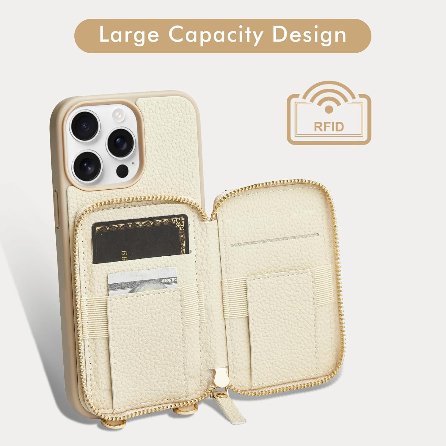 LAMEEKU for iPhone 15 Pro Wallet Case with Credit Card Holder, Zipper Leather Crossbody Case with Phone Grip Holder Stand Wrist Strap Lanyard for Women for Apple iPhone 15 Pro 6.1 inch Beige