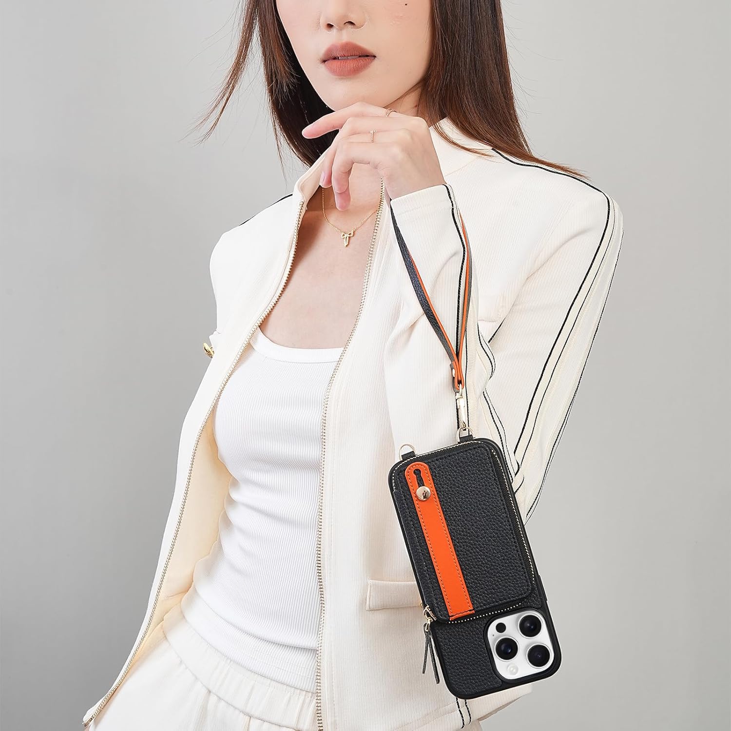 LAMEEKU for iPhone 15 Pro Wallet Case with Card Holder, Zipper Leather Crossbody Case with Kickstand Wrist Strap Lanyard for Women, Protective Cover with Phone Grip Holder Stand 5G 6.1 inch Black