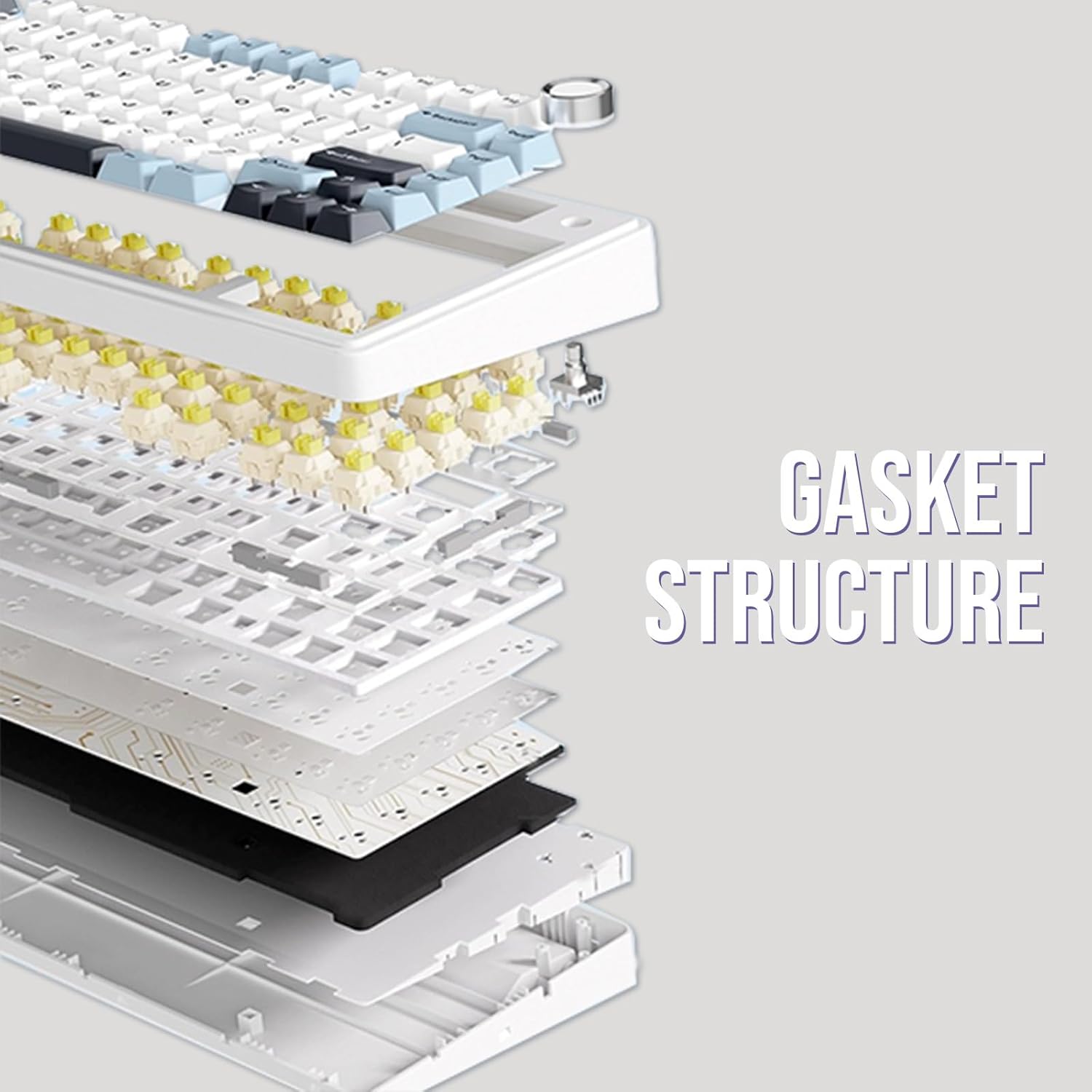 - ăOptimized 75% Compact Layout&Innovative Leaf-Spring Gasket StructureăThe F75 redefines space efficiency with its 75% compact layout. This design integrates all the essential keys in a smaller footprint, making it perfect for streamlined desks and mobile setups without sacrificing functionality. Experience the pinnacle of comfort with the leaf-spring gasket structure. This advanced design ensures a flexible yet firm typing experience, reducing fatigue during prolonged use while maintaining a consistent and responsive key feel.