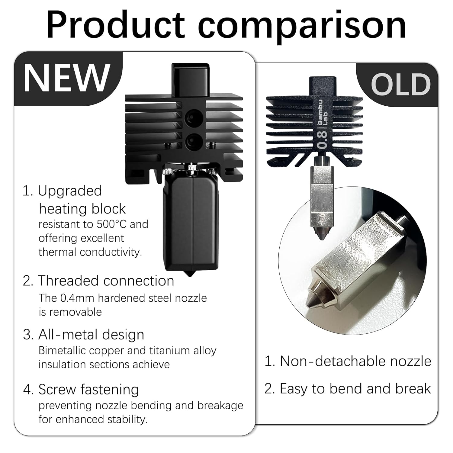 - 【Upgrade Design Bambu Lab V2.0 hotend】This kit is upgraded to a completely new design version, The heating block has been upgraded to chrome zirconium copper nickel electroplating treatment, with high-temperature resistance of 500℃ printing and fast thermal conductivity.