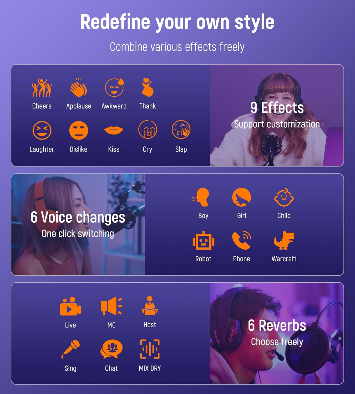 - ✔️[Total Dynamic Control at Your Fingertips] Create and trigger custom effects with 9 programmable pads (up to 15 seconds each). The sound card for live streaming includes 6 reverb modes, 6 voice effects (robot, child, boy, girl, etc.), and built-in DJ sounds—all ready for real-time recording and one-tap play. Personalize your stream, wow your audience, and build your signature sound effortlessly