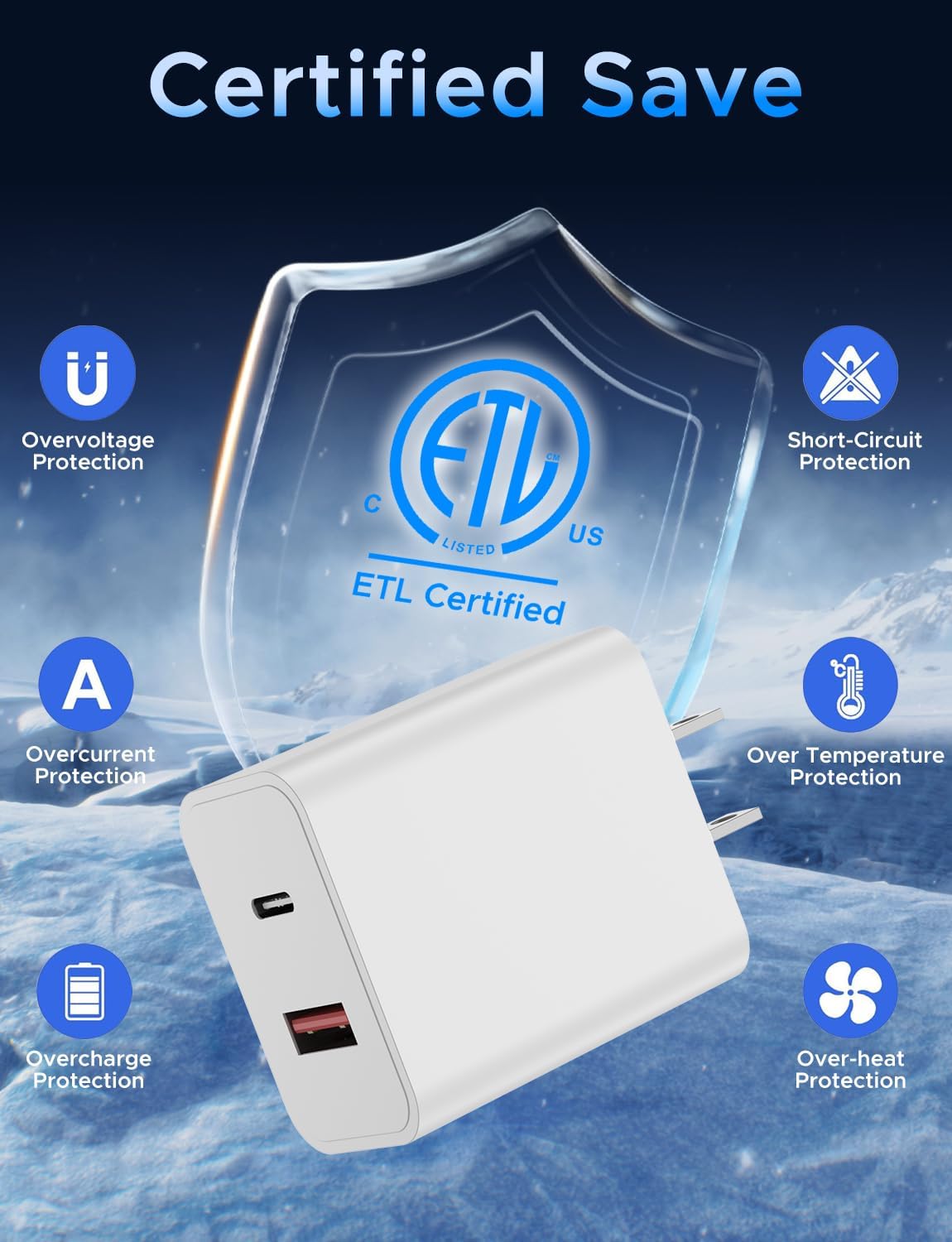 - 🔹【PD20W USB C/A Charger Included】Suitable for the U.S. and the World electrical standards, It has ETL(US),FCC,CE,ROHS,certificated, The shell is made of high quality ABS material, heat resistance and low temperature resistance, chemical resistance and excellent electrical properties. The Charger Internal High Quality Chips Protect Your Devices from over Heating, Short-circuiting and over Charging