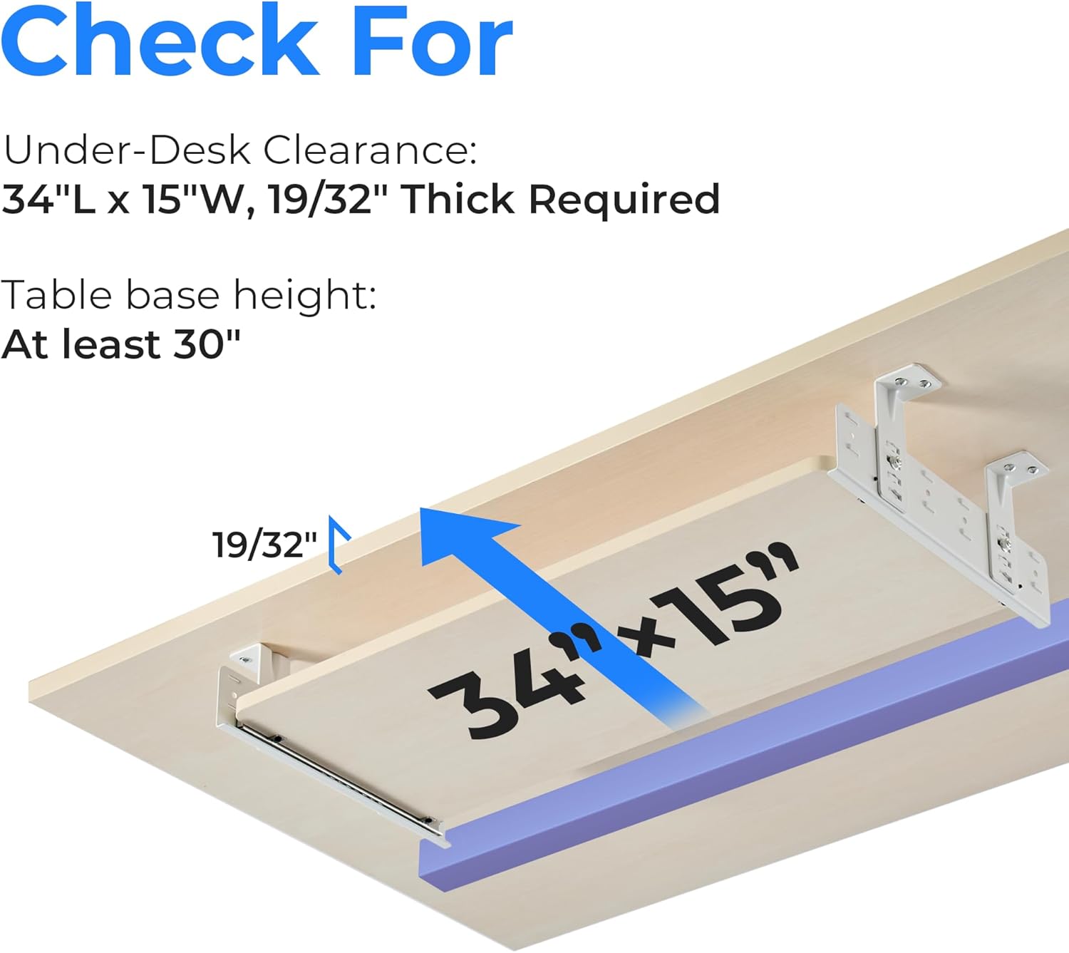 - 【Wide Compatibility】: This keyboard drawer is designed to be compatible with a wide range of desks, and is suitable for desktops made of materials such as wood, MDF, or other materials with similar characteristics (not compatible with plastic, hollow core panel, stone, glass, etc.). The keyboard shelf can be easily mounted under the desk for flexibility in adding desktop space. Note: The under-desk installation space should be 34"L x 15"W, with a minimum distance of 30" from the bottom of the tabletop to the floor. The desk should also be at least 0.59" thick. Please double-check the measurements and ensure there is enough legroom after installation before purchasing.