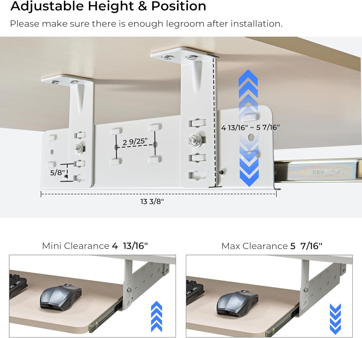 - 【Optimized Desk Space】: The keyboard attachment for desk is designed to optimize your desk space. When not in use, you can slide the keyboard platform under the desk easily. Create additional room on the desktop surface, allowing you to organize your workspace more efficiently. The desk extender tray comes with detailed installation instructions, and our local customer support team is always there to provide prompt assistance.