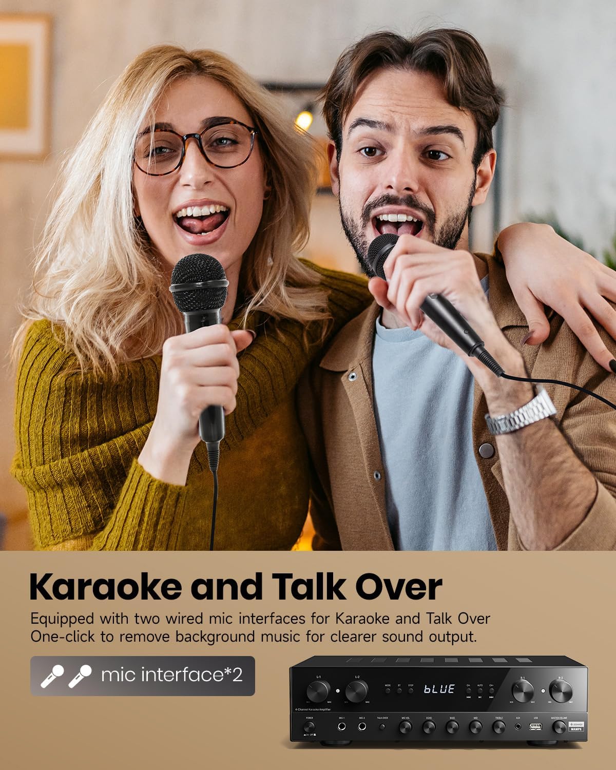 - DUAL MIC INTERFACES: Equipped with dual 1/4'' microphone jacks for your karaoke party. Plus the Talk Over function can lower the background music for clearer sound output in events/ hosting/ speech occasions