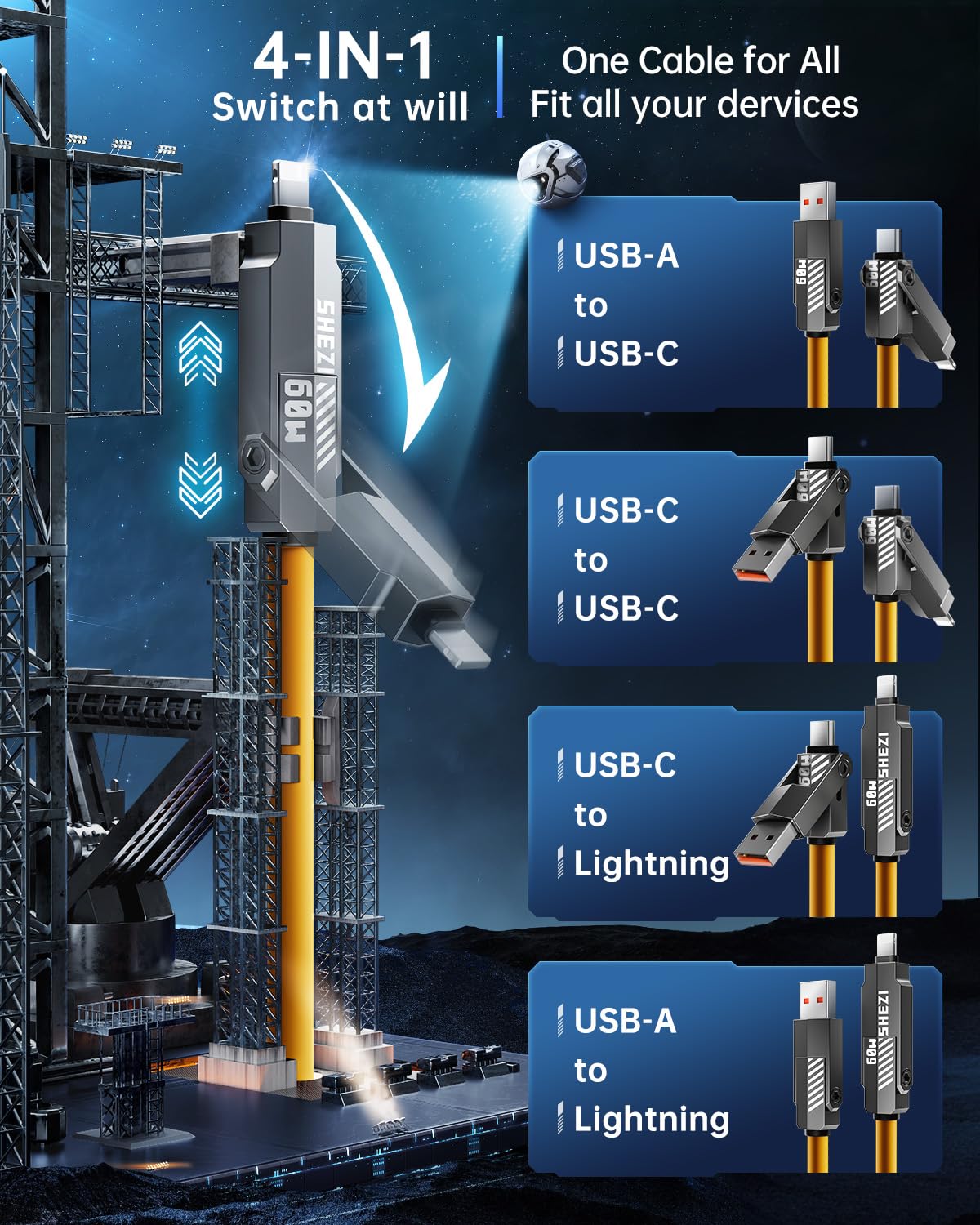 - Versatile 4-in-1 Design: SHEZI upgraded 4-in-1 multi charging cable adopts a rocket shape design of multiple ports, which meets your variety of charging needs in one cable.Charge and sync your devices without the hassle of switching between multiple cables. Simplify your charging setup with our versatile 4-in-1 usb-c cable.
