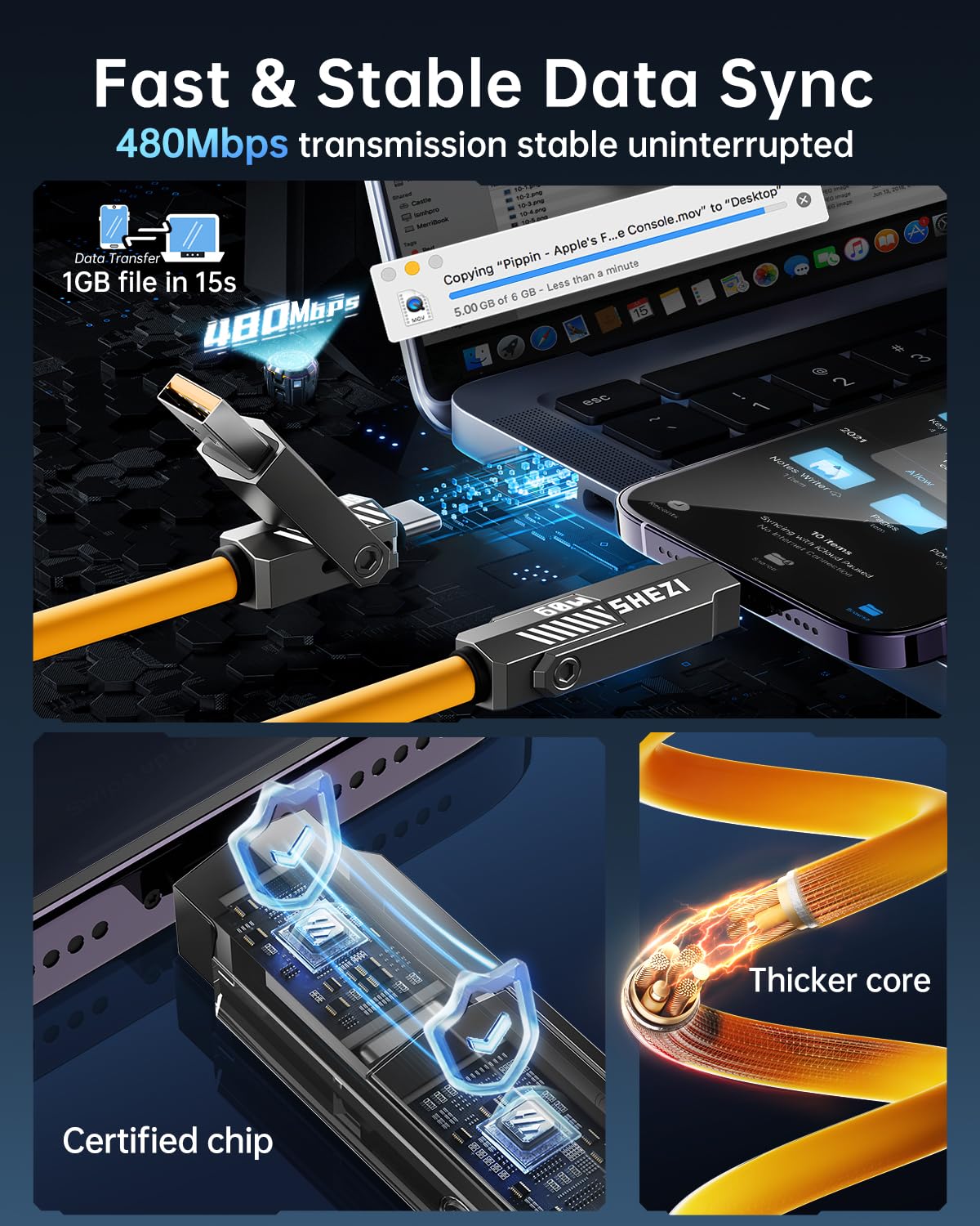 - Built to Last USB-C Cable: This multi-functional USB-C to USB-C cable is made of upgraded anti-tangle nylon braided and rust-proof zinc alloy connectors, ensuring it withstands daily wear and tear. With over 4,000 bend and plug/unplug tests, this 4 in 1 cable guarantees long-lasting durability even with frequent use.