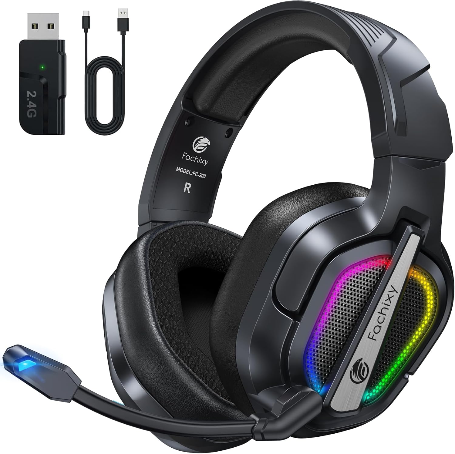 - [2 Connection Modes & Multi-Devices Support] ① Enjoy seamless connectivity with the Fachixy wireless gaming headset via a 2.4GHz USB dongle, compatible with PC, PS4, PS5 and more controllers. ② Bluetooth mode of gaming headset is compatible with Switch (Mic not supported) and most mobile devices like smartphones, tablets, allowing seamless changing between different scenarios. NOTE: Both 2.4G and Bluetooth modes are NOT compatible with Xbox all Series.