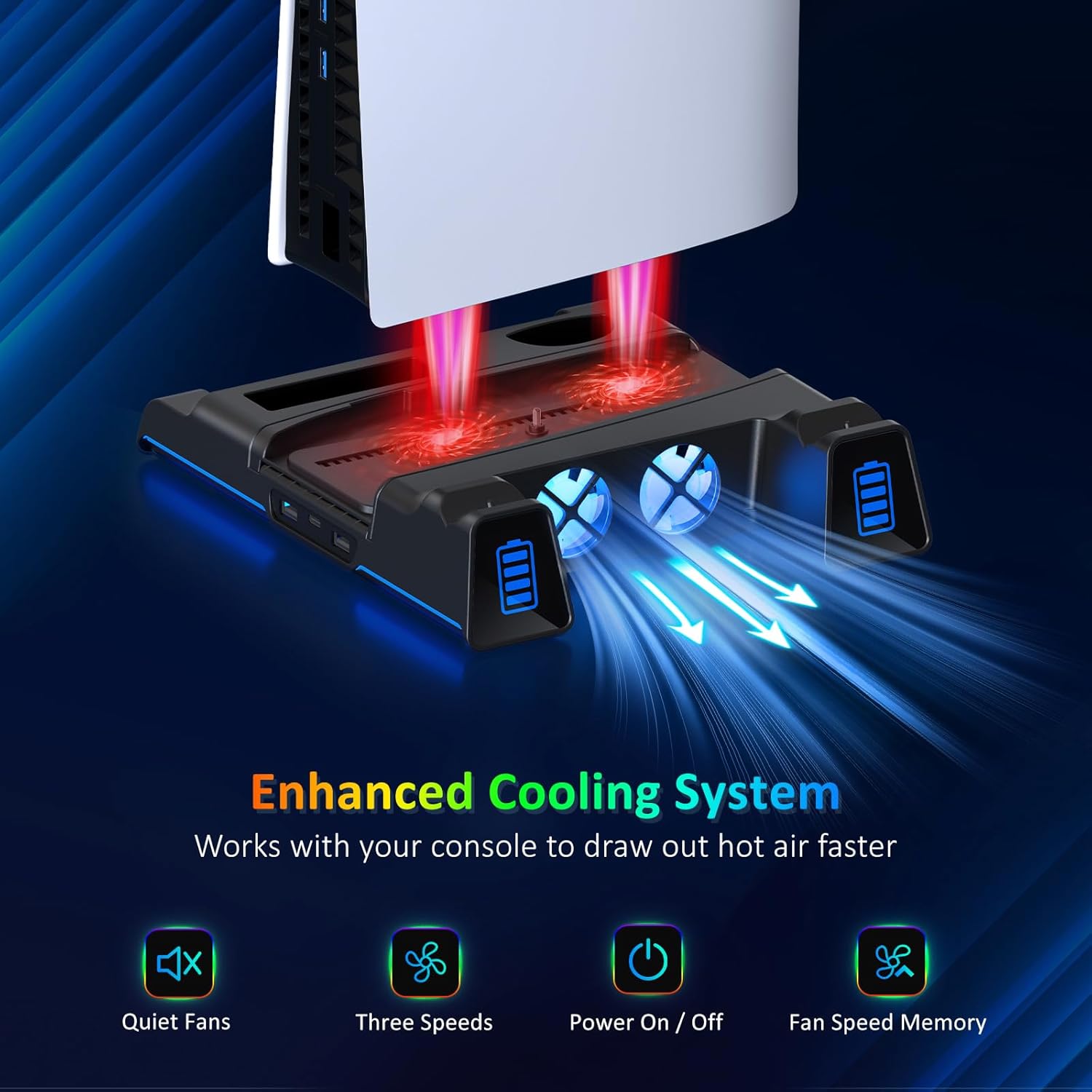 NexiGo PS5 Silent Cooling Stand for Both PS5 and New PS5 Slim Consoles, RGB LED Light, Dual Charging Station, Compatible with Dual_Sense Edge Controller, Hard Drive, Headset and Remote Holder, Black