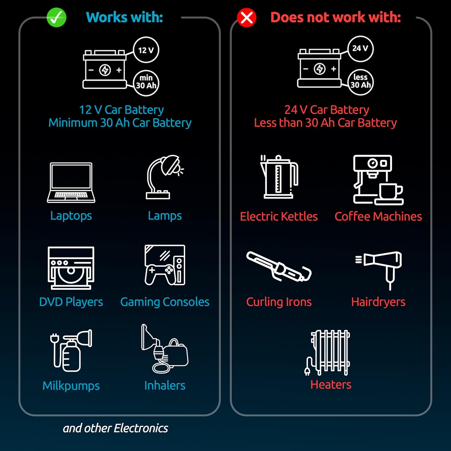 - QUIET OPERATION: Equipped with a quiet fan, this 300 watt inverter maintains optimal temperature without disturbing noise, perfect for a peaceful journey.