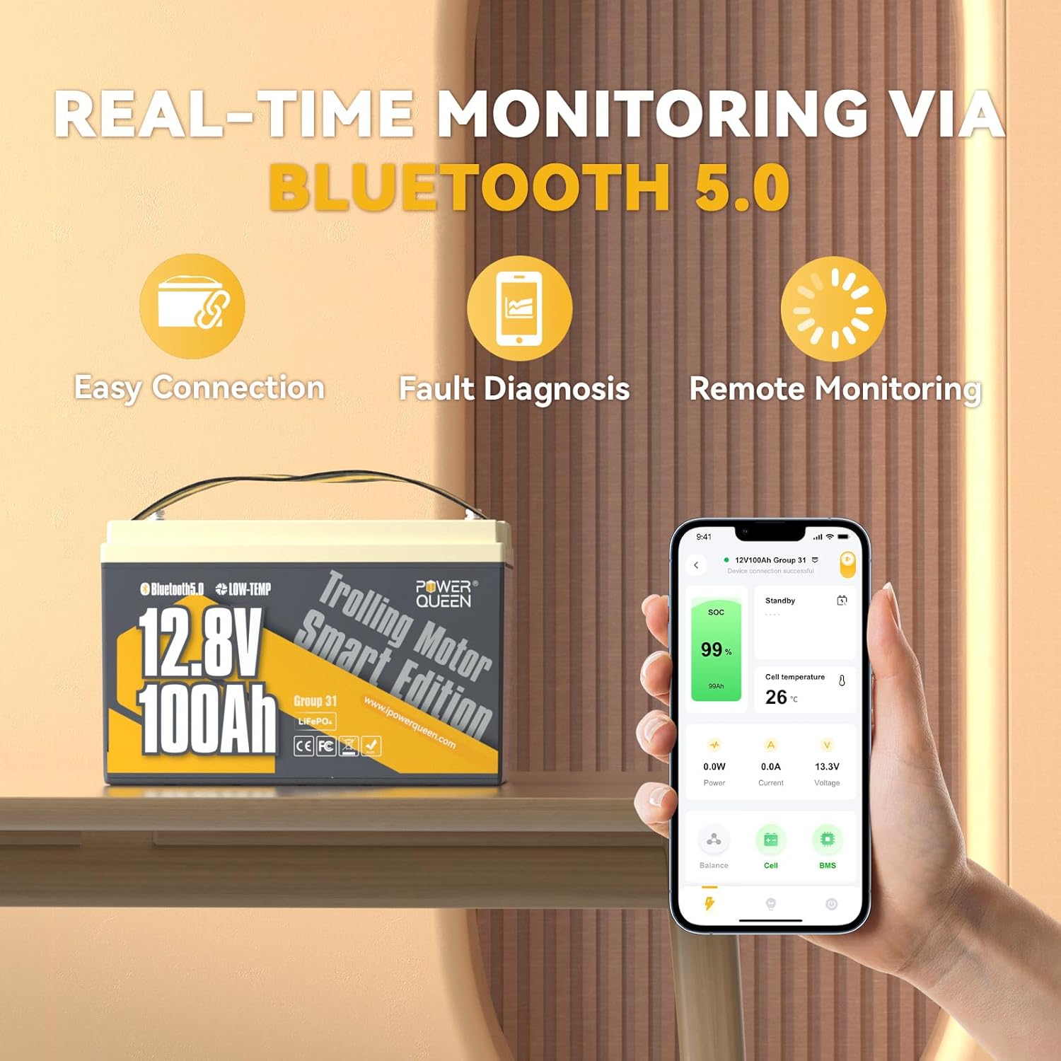 Power Queen 12V 100Ah Group 31 Battery Bluetooth 5.0, Deep Cycle LiFePO4 Battery Max. Output Power 1280W, 100A BMS with Low-Temp Cut-off Protection for RV, Trolling Motors, Solar System