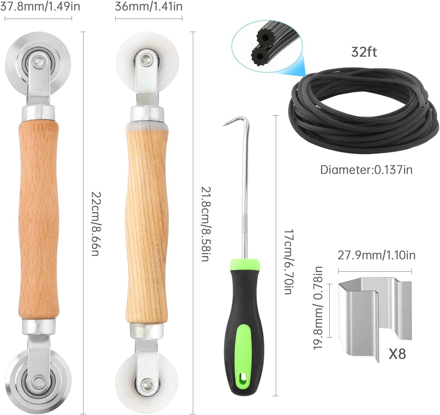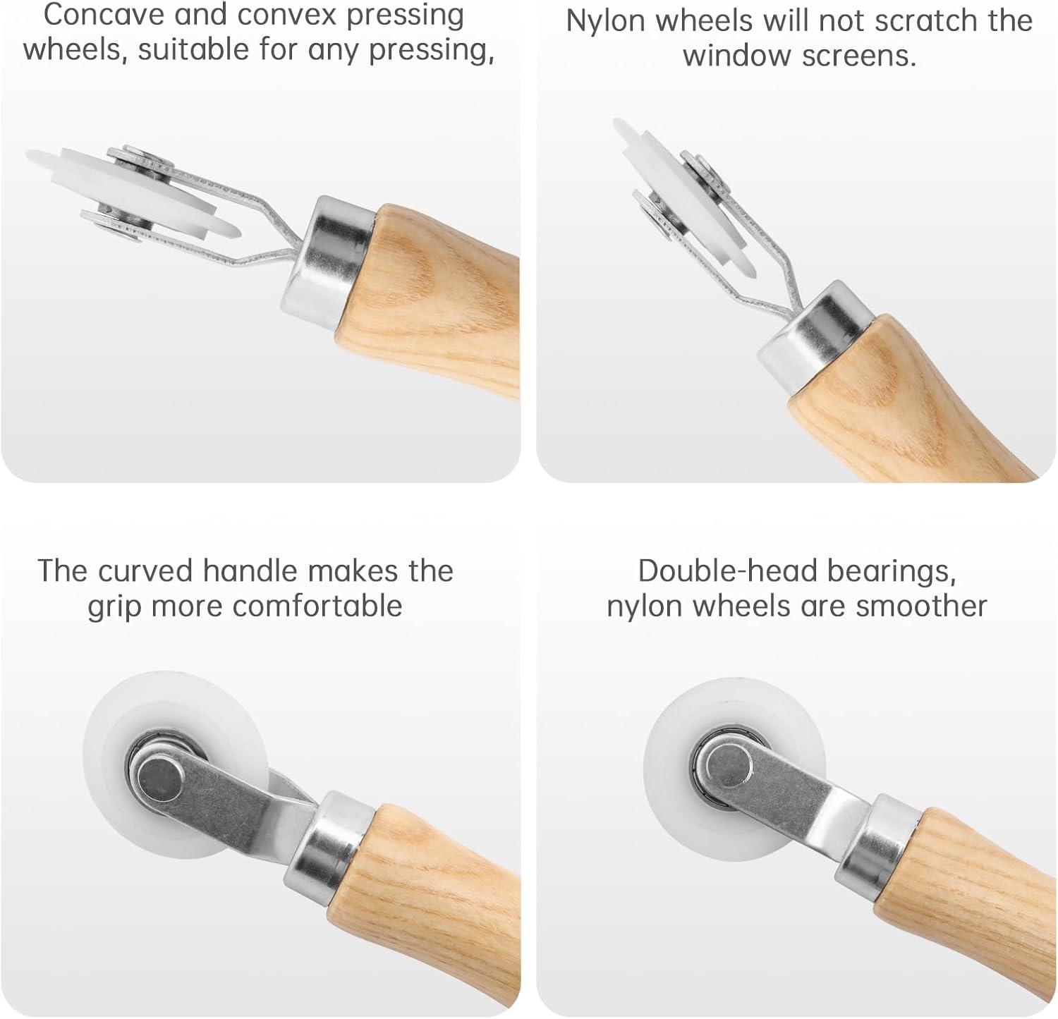 - 2 Kinds Screen Roller Tool: Our kit includes steel roller and nylon roller. Solid wood handle + double carbon steel bearing wheels. Metal roller -Recommended to install metal mesh. Nylon roller-Recommended to install fiberglass mesh, The screen rolling tool has a double side, convex wheel, and concave wheel