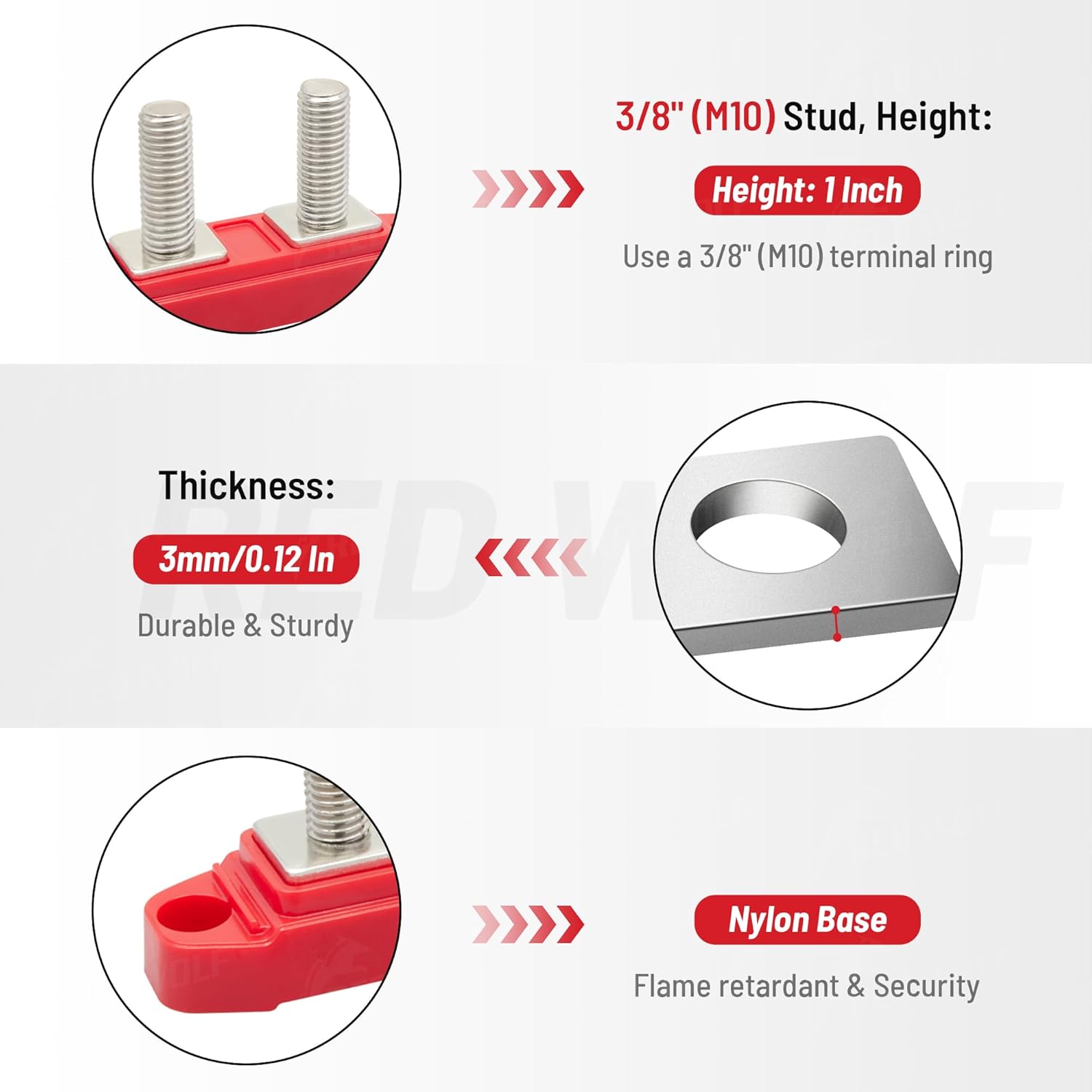 - Widely Applicable: RED WOLF busbar 3/8 inch dual stud is an ideal for connecting batteries/equipment to solar systems such as RVs, Yachts and Marines