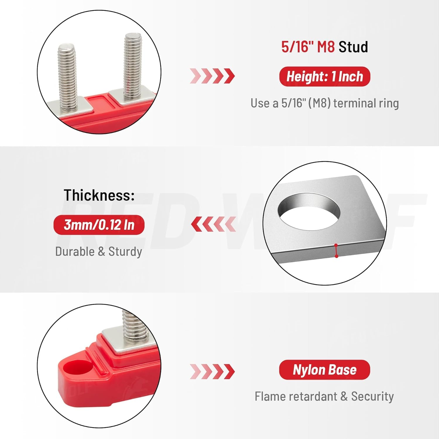 - Widely Applicable: RED WOLF busbar 5/16 inch dual stud is an ideal for connecting batteries/equipment to solar systems such as RVs, Yachts and Marines
