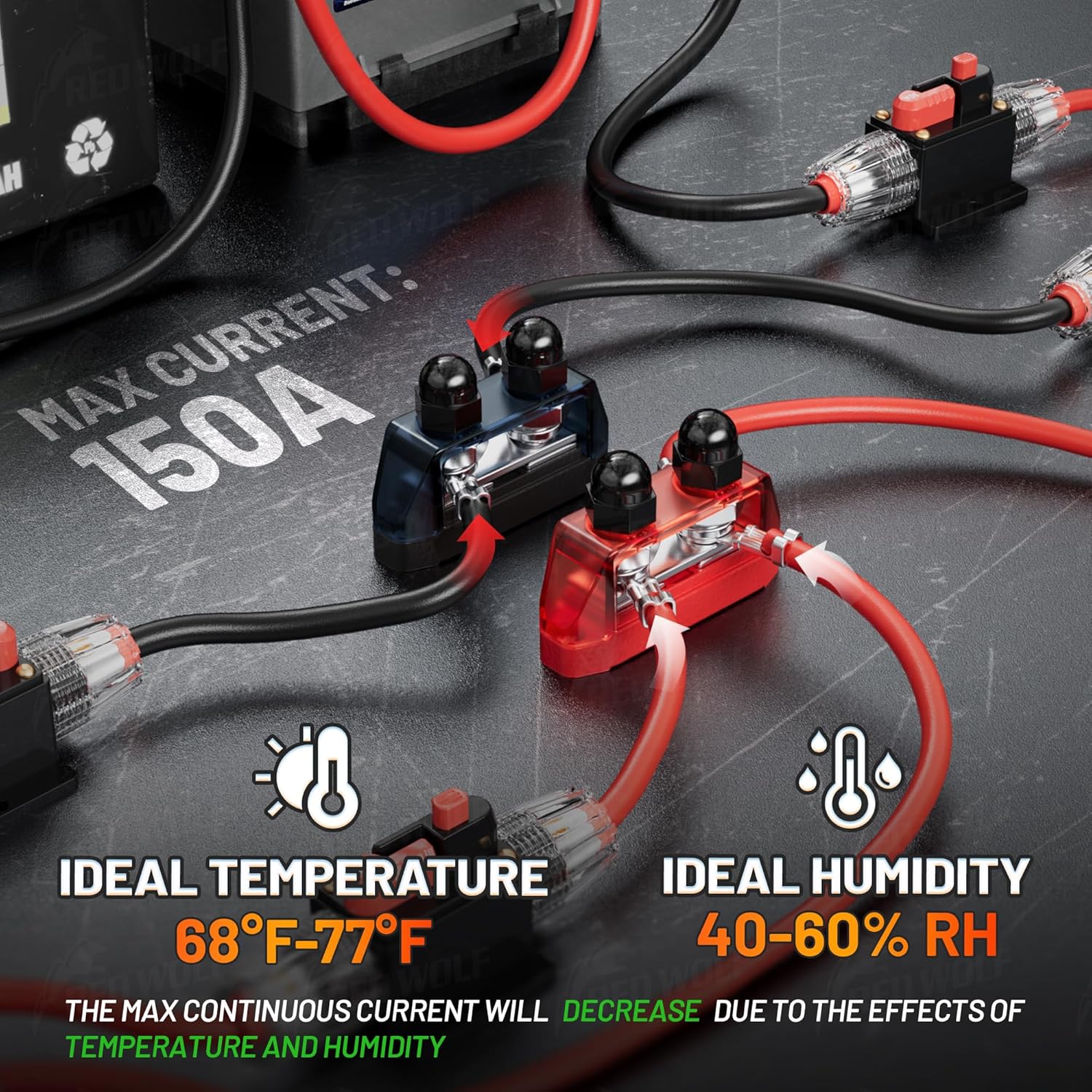 - Specification: Stud size: 5/16"(M8) dual stud; Max voltage: 48V DC; Max continuous amperage: 150A DC; Power busbar is able to reach 150A (MAX) when input/output voltage between 12V-48V DC, NOTE: MAX Continuous Current will DECREASE with Temperature & Humidity Effection