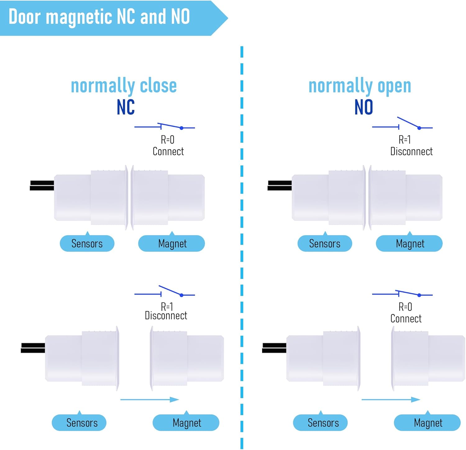 - 【Normally open (NO)】Normally Open type with 2 wires, When the switch is separated from the magnet, the circuit is conductive(light on); When the switch is close to the magnet, the circuit is not conductive(light off).