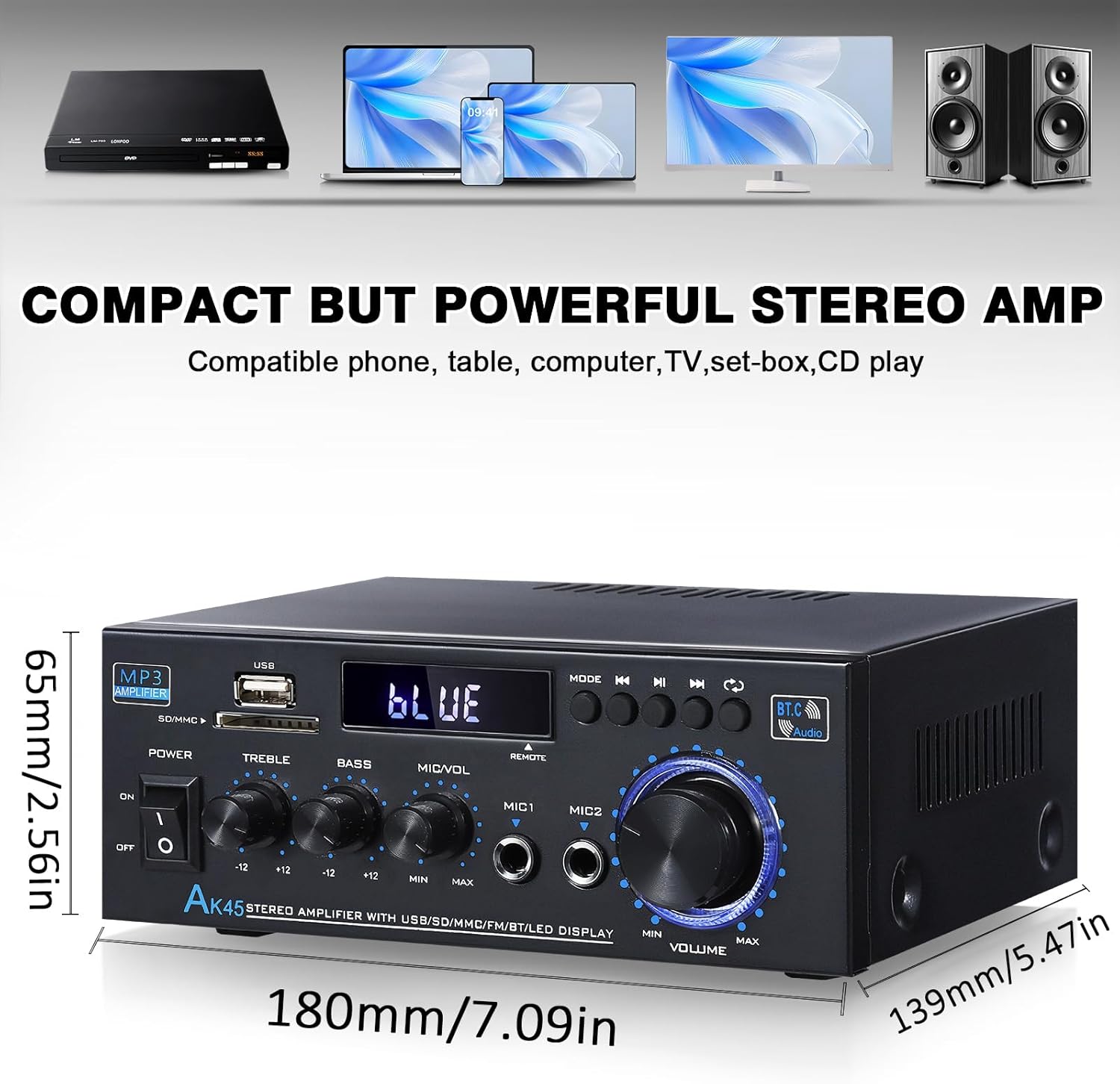 AK45 Stereo Receivers Amplifier Home Audio with Bluetooth, 300W, 2.0 Channel Power Amplifier for Home Stereo Syetem with RCA,SD,FM,USB, MIC in,Bluetooth Receiver for Karaoke,Studio