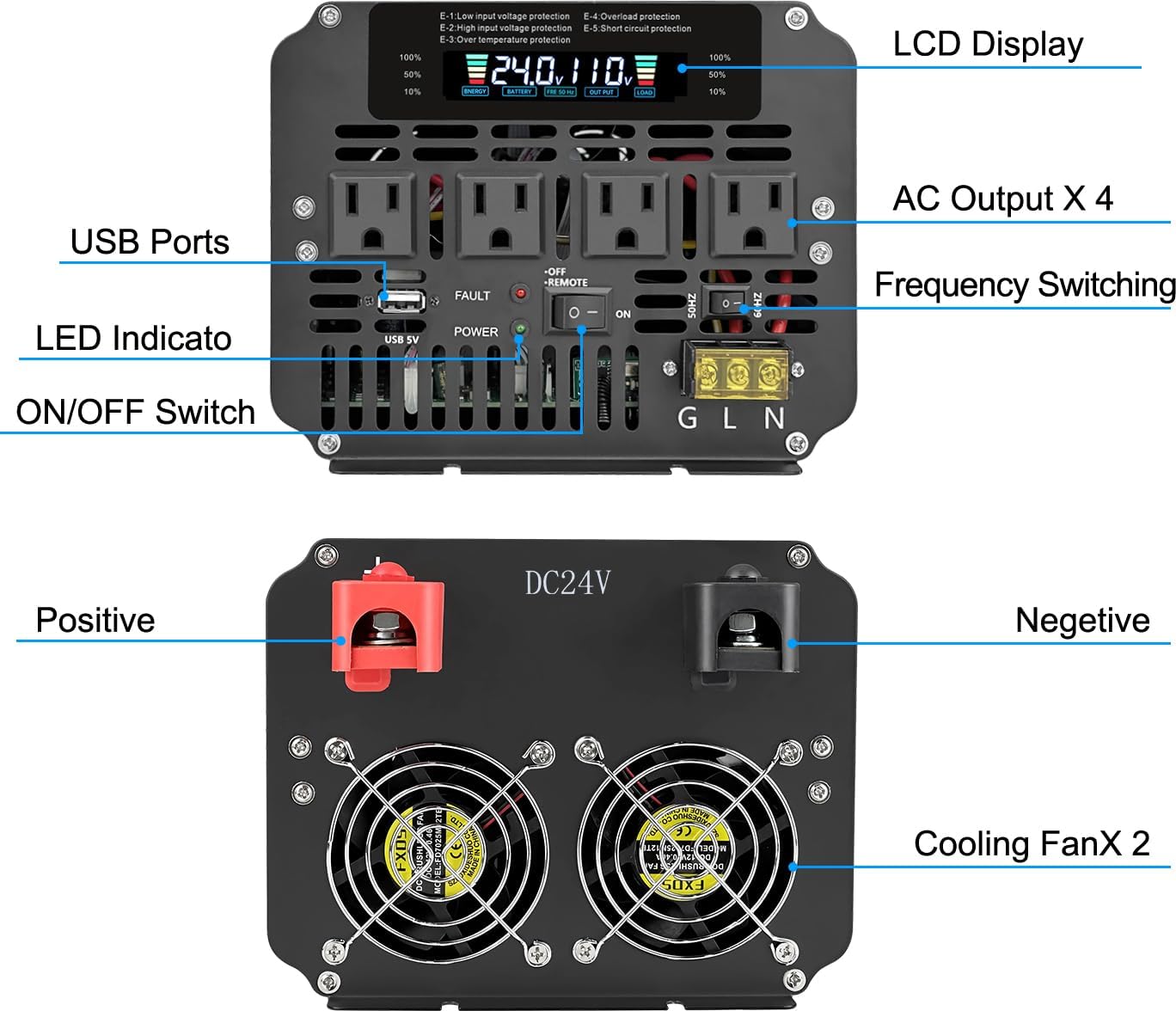- 【Smart Cooling Fan + Full Safety Protections】Built-in intelligent cooling fan activates only when internal temperature exceeds 104°F(40°C) or load exceeds 45%, ensuring quiet operation and optimal heat dissipation. Includes protections for over/under voltage, overload, short circuit, reverse polarity, and overheating