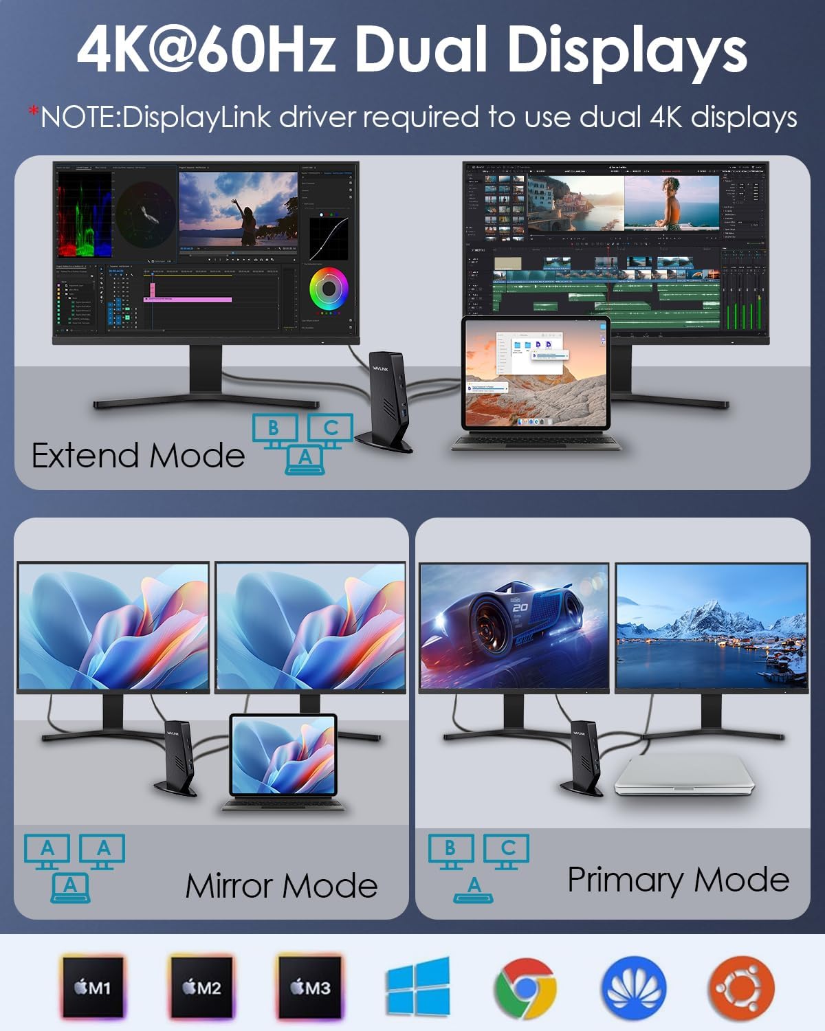 - [Dual Display Docking Station] Laptop docking stations supports up to 5k@60Hz single display, or dual 4K@60Hz display (insert any of the dual display and dual hdmi docking ports). Enjoy high-definition visual feast and powerful productivity for your multitasking work, gaming, conference, various scenarios. Note: This displaylink docking station to achieve 4K@60Hz each connected monitor and cable must support the desired resolution and refresh rate.