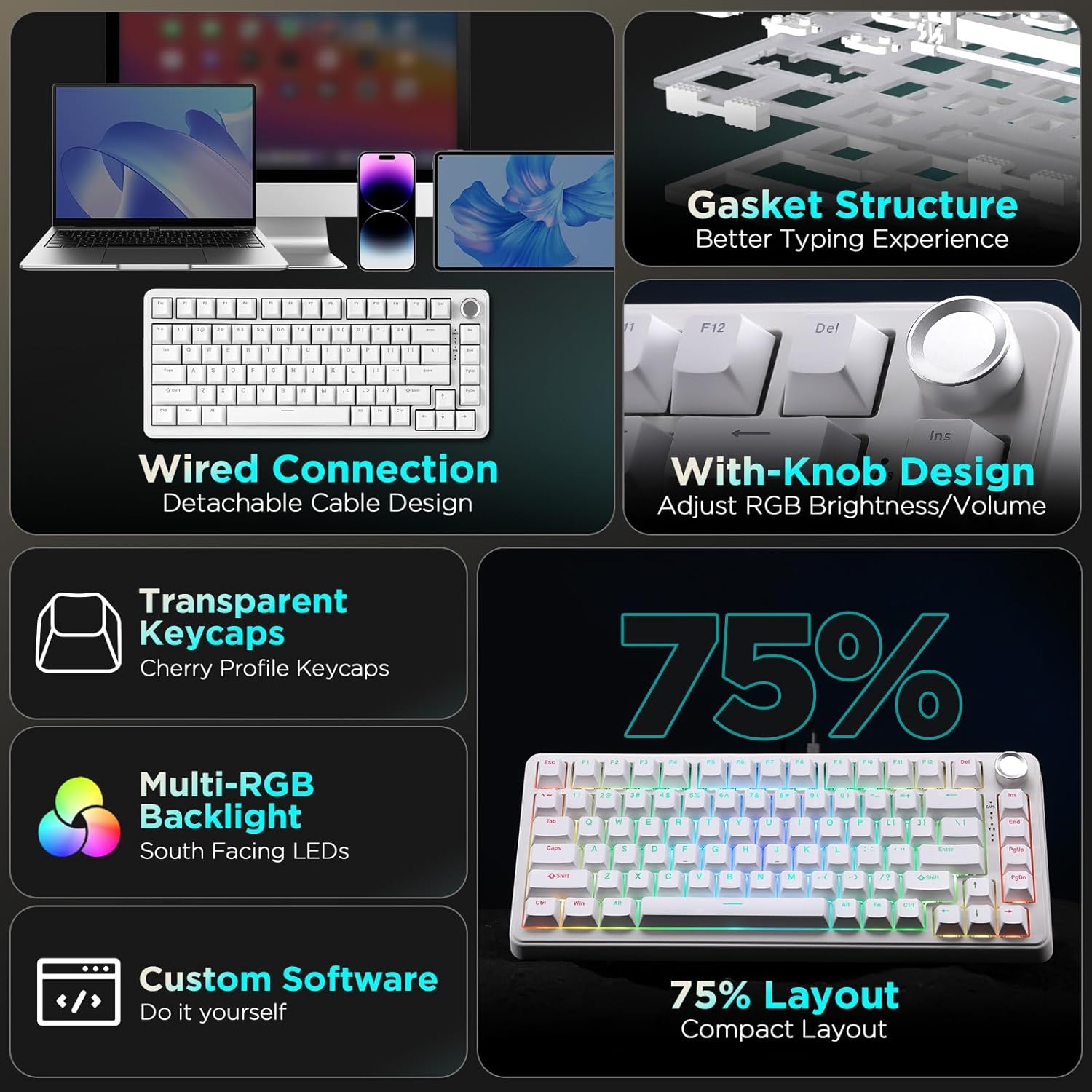 - Immersive RGB Lighting & Knob Control: : Customize your setup with over 20 dynamic RGB backlighting effects. The B75 RGB keyboard provides a fully immersive experience, with a multi-function knob for easy adjustments of backlight brightness and device volume, allowing for smooth transitions between different modes.