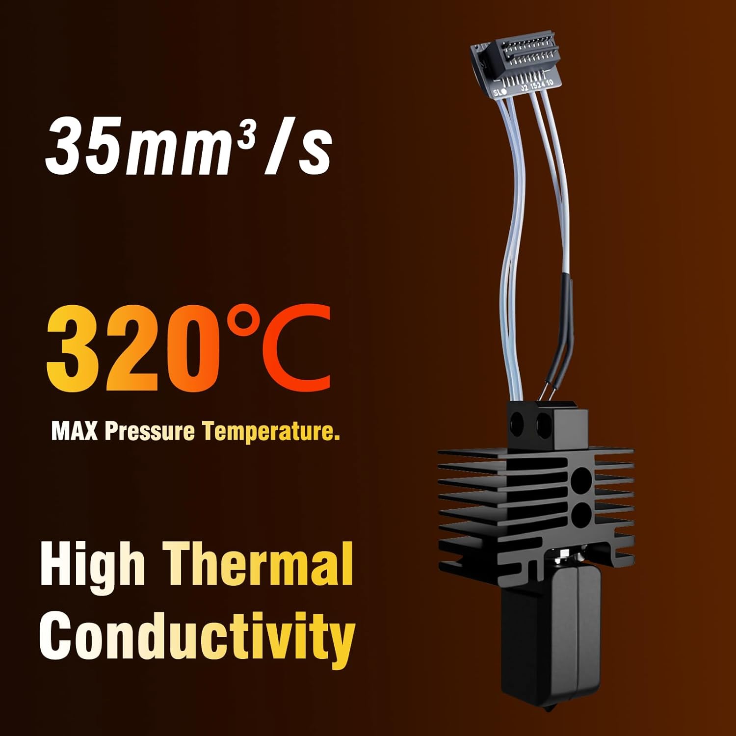 - 【All Metal Design】All metal smooth insulation, composed of bimetallic copper and titanium alloy insulation sections, provides a better heat dissipation effect.Print flow up to 35mm³/S, Overall max temperature is up to 320°C degree.The throat is closely integrated with the heating block, and the structure of the throat has been upgraded. A step limit has been added at the fitting point with the heating block, reducing the phenomenon of material leakage and detachment.