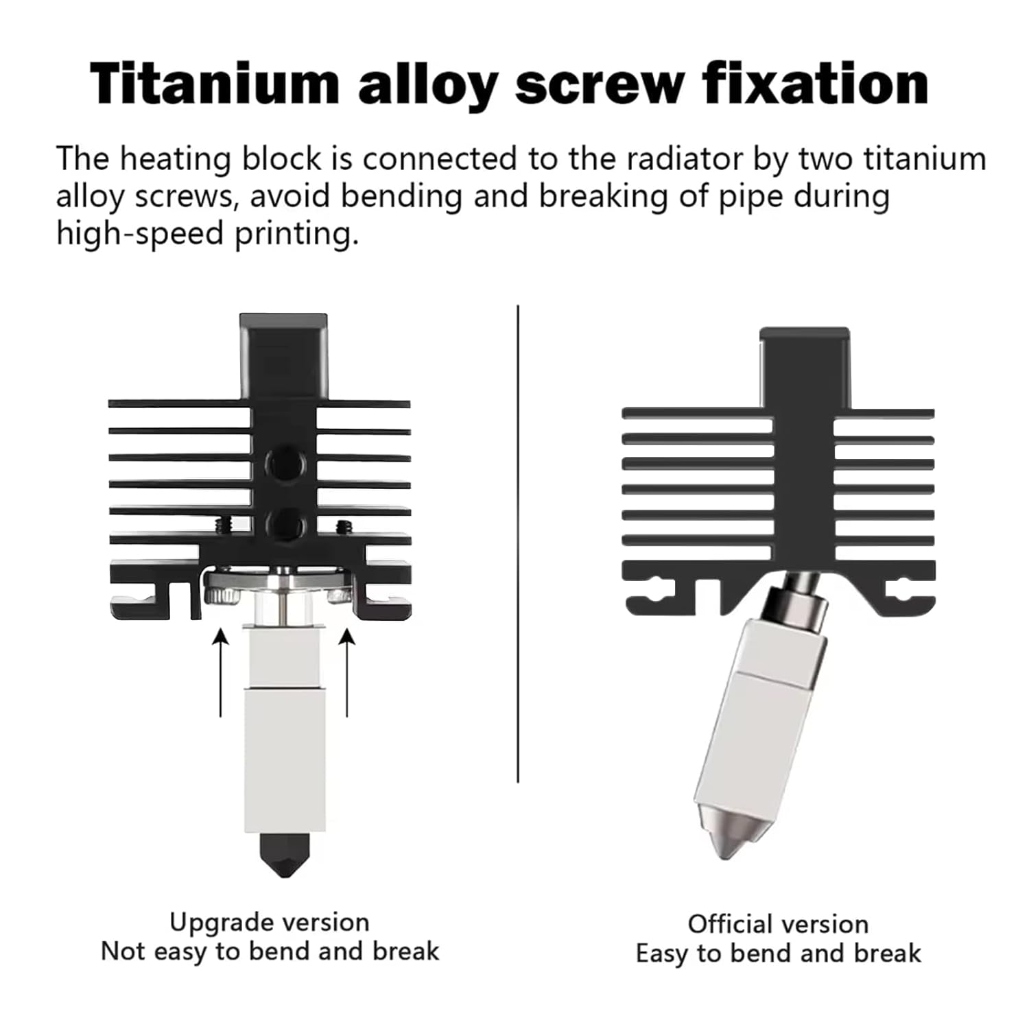 - 【Screw fixation】The connection between the heating block and the radiator is upgraded to two titanium alloy screws for fixation, avoiding the bending and breaking of the throat during high-speed printing. At the same time, titanium alloy has better insulation effect and increases stability.