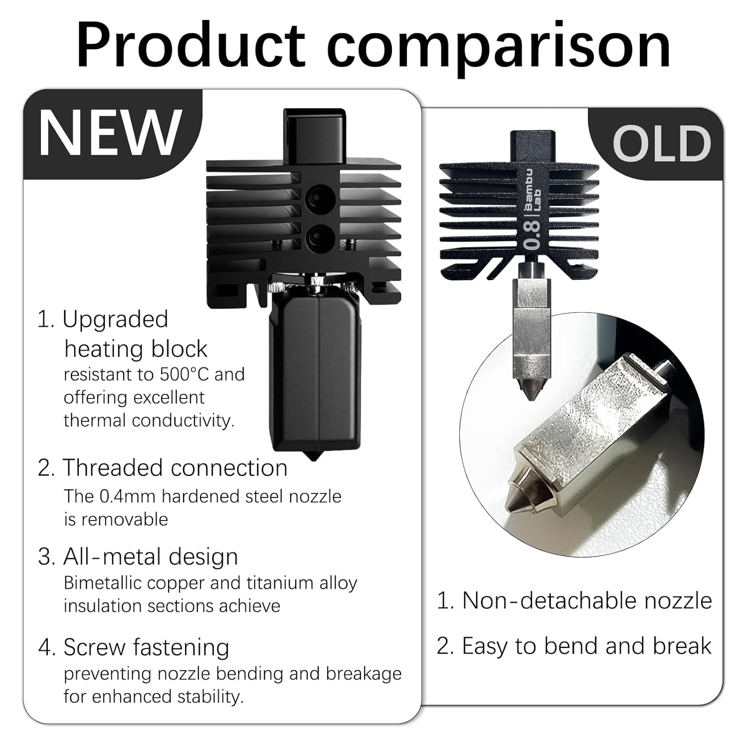 - 【Upgrade Design Bambu Lab hotend】This kit is upgraded to a completely new design version, The heating block has been upgraded to chrome zirconium copper nickel electroplating treatment, with high-temperature resistance of 500℃ printing and fast thermal conductivity.