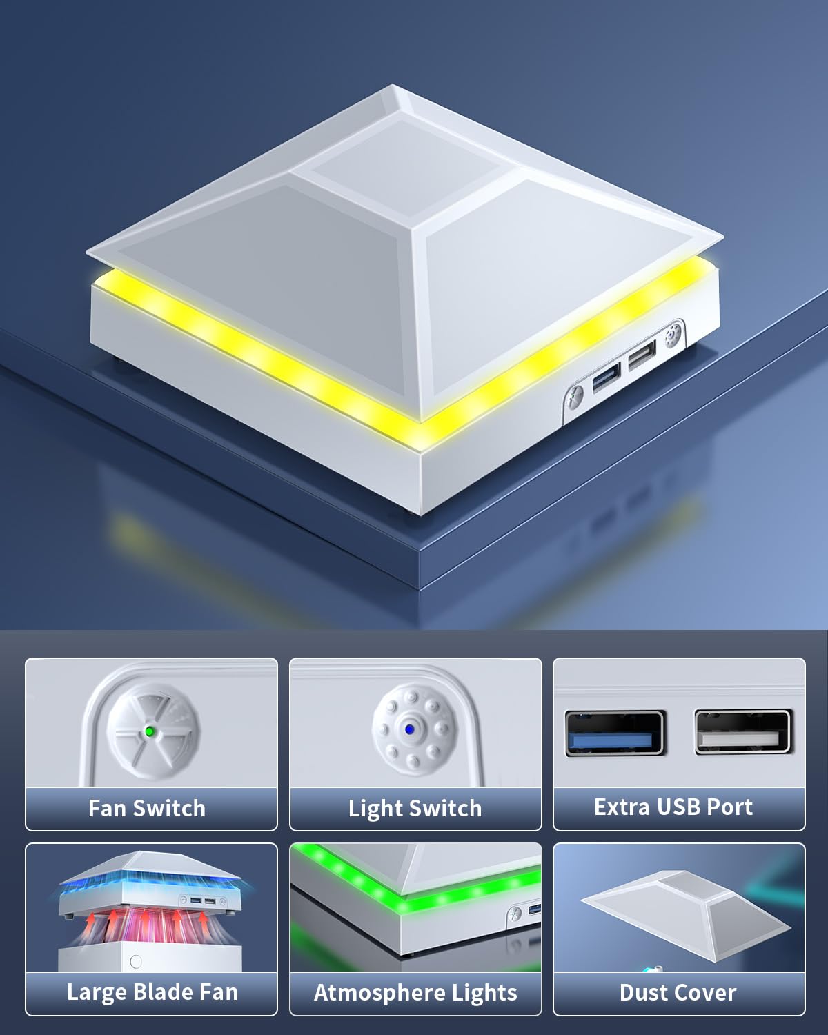 - 【Necessary for Xbox Series X】---- This product integrates many functions, such as top cooling fan, dust-proof, light strip, USB interface for data transmission and USB port for charging. It helps to prevent for Xbox Series X console from over-heating and dust to extend the life of your console. (NOTE:When the console is working, the dust cover of the fan can be removed to speed up the heat dissipation effect. Alige the two holes under the dust cover first, then cover the dust cover.)