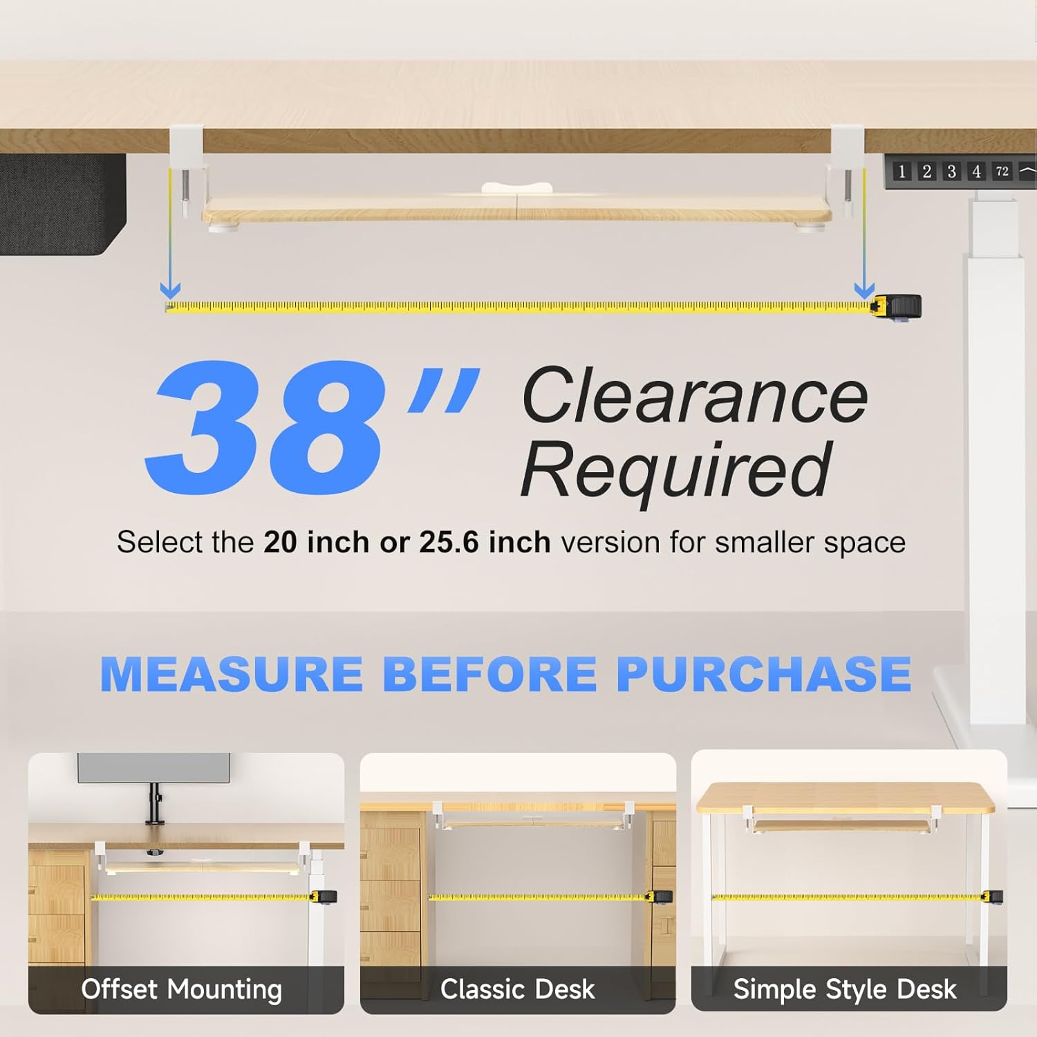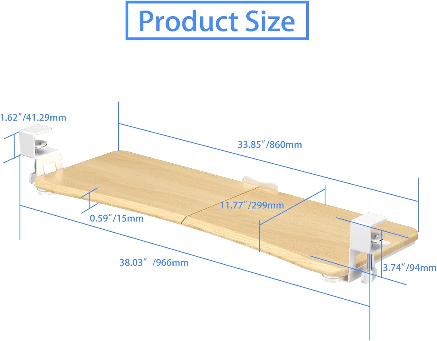 - Universal - This 34" (38" including clamps) x 11.8" under-desk keyboard tray holds your keyboard, mouse, and other small accessories below the desktop to add work space. Please not it does NOT fit if your desk thickness is over 1.57”.
